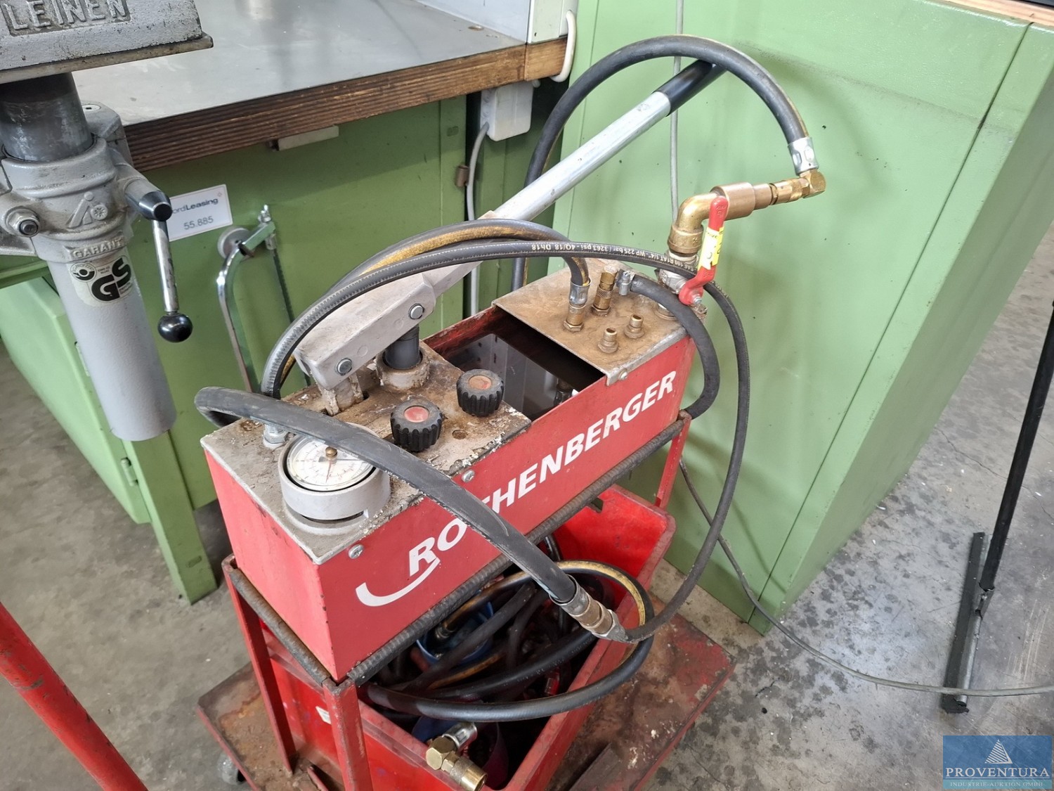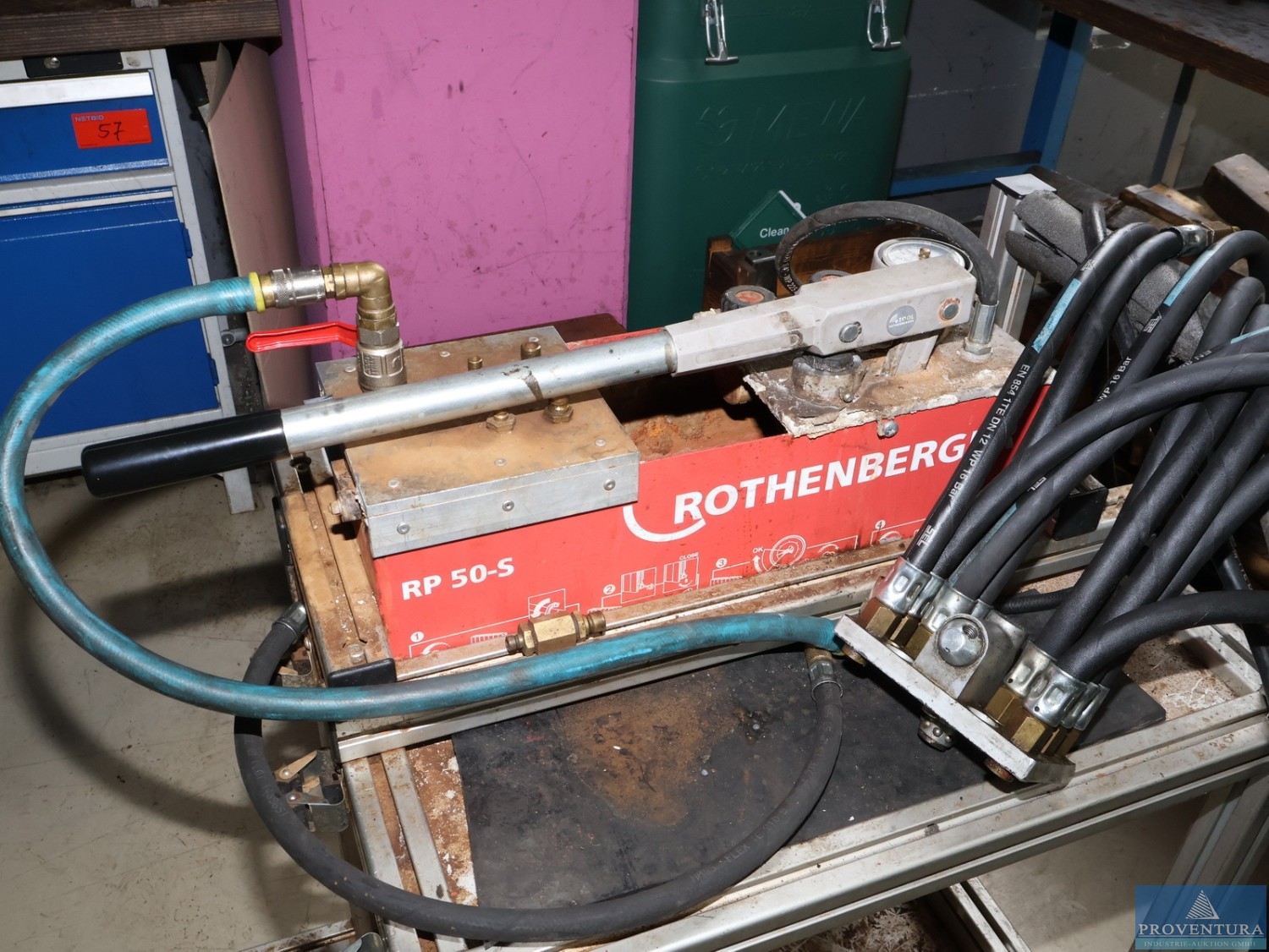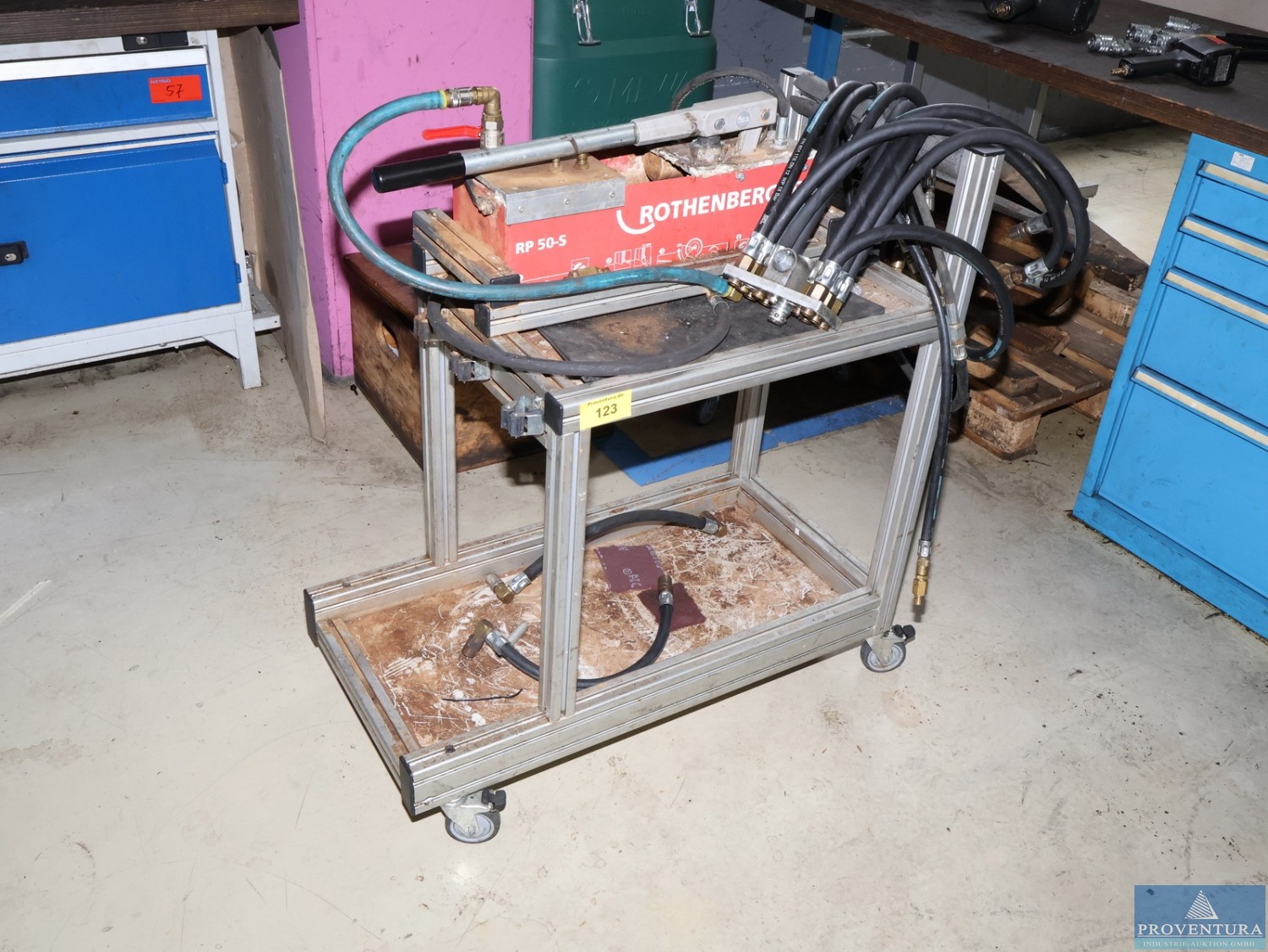 Prüfpumpe ROTHENBERGER RP 50-S auf Transportwagen aus Aluprofilen