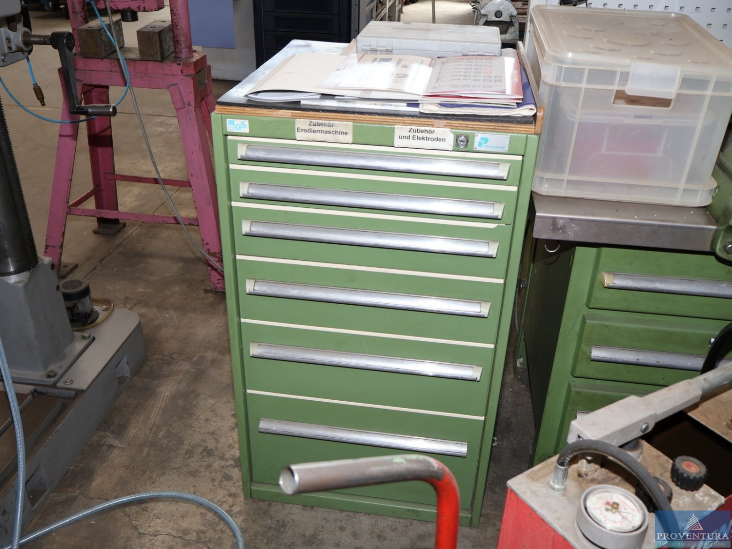 Magazin-Schubladenschrank Stahl grün 6 Schübe, ca. 75x90x80t cm, mit Inhalten