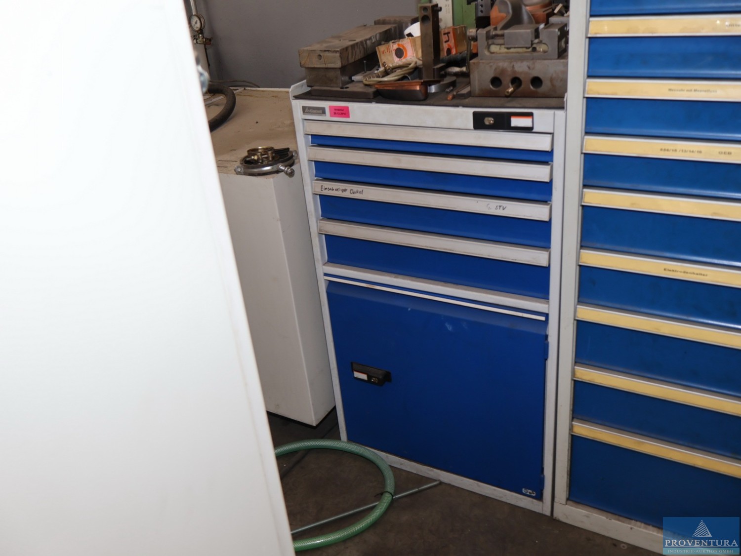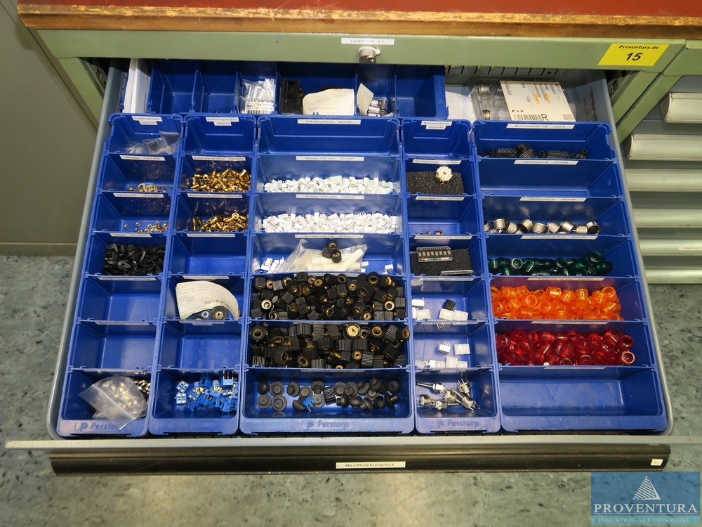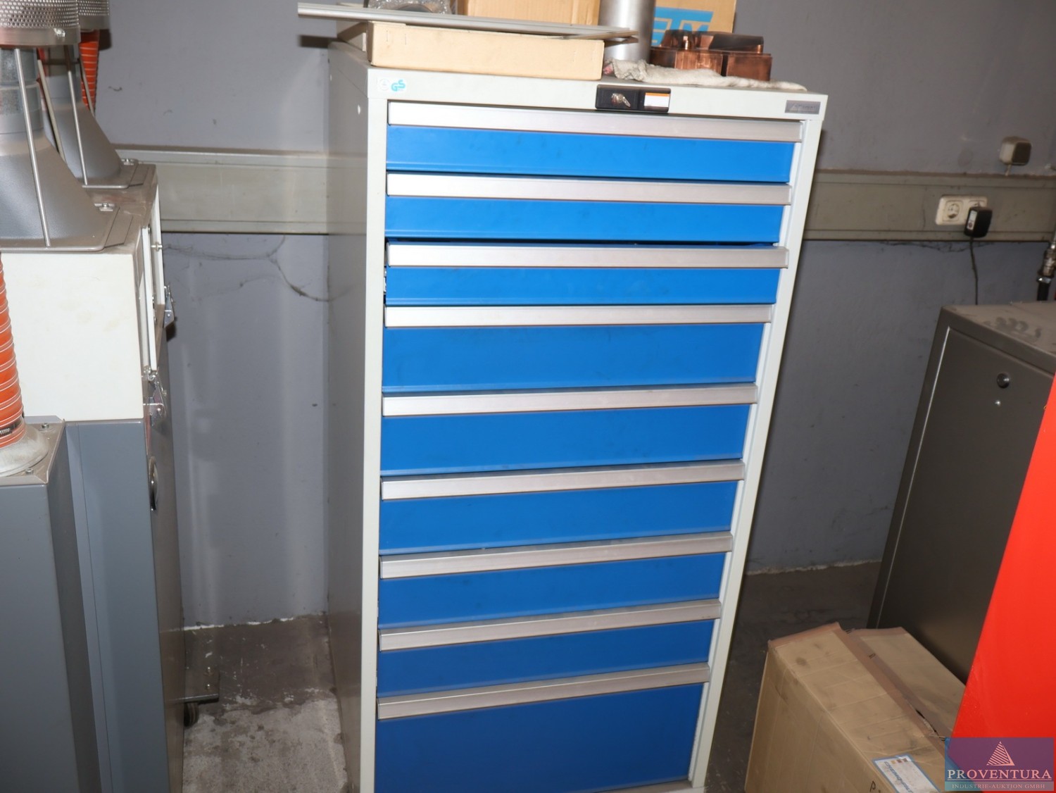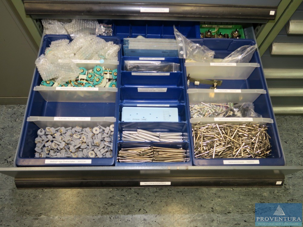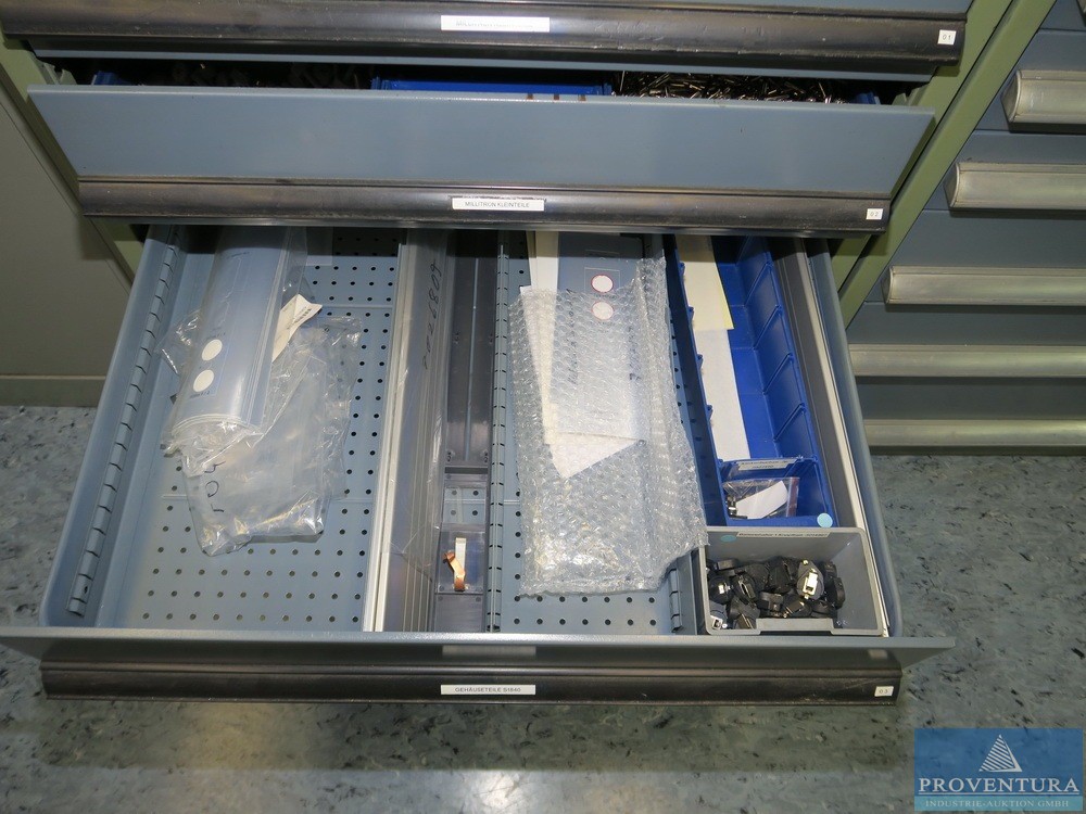 Magazinschrank GARANT weiss/blau ca. 150 cm 10 Schubladen div. SIEMENS SPS-Teile, Schrank 19