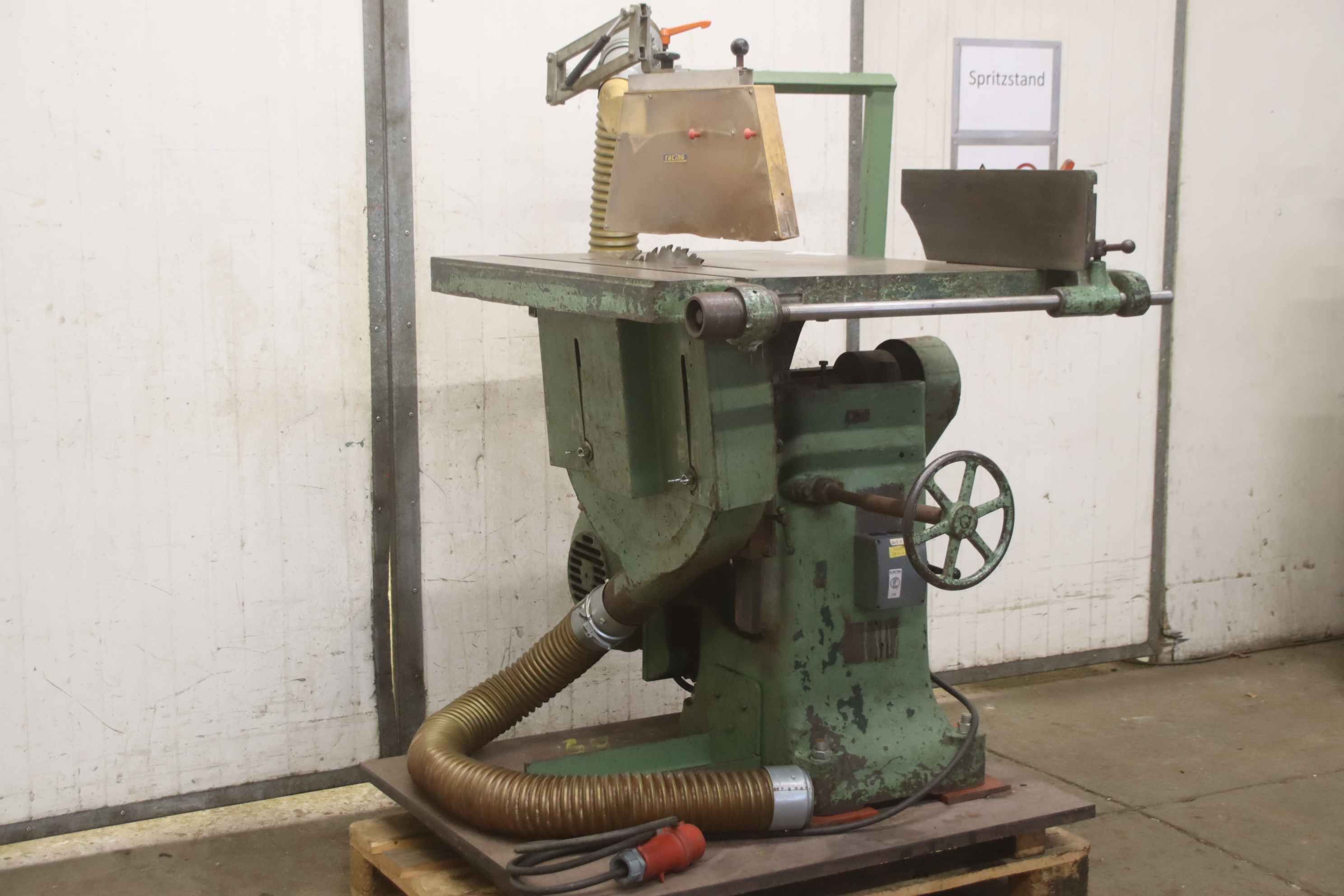 Unterflur-Zugkreissäge, Ablängsäge, Zugsäge, Kappsäge, Formatkreissäge, Tischkreissäge, Kreissäge -Hersteller: White Paisley, Tischkreissäge auf massivem Untergestell -Motorleistung: 6,3 kW / 1430 U/min -Sägeblatt: Ø 550 mm -max. Schnitthöhe 180 mm -Schnittbreite: bis 455 mm -Tischhöhe: 850 bis 1000 mm -Späneabsaugung: Absauganlage kann gegen Mehrpreis mitgeliefert werden -Abmessungen 1240/1100/H1500 mm -Gewicht: 762 kg
