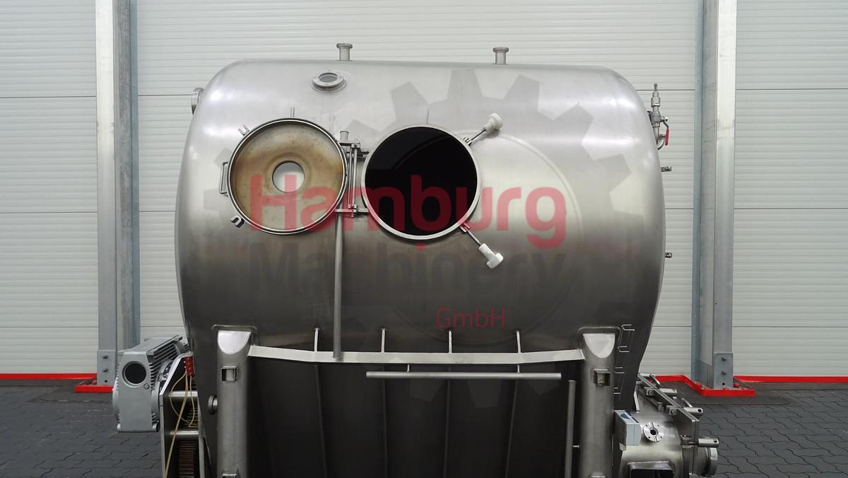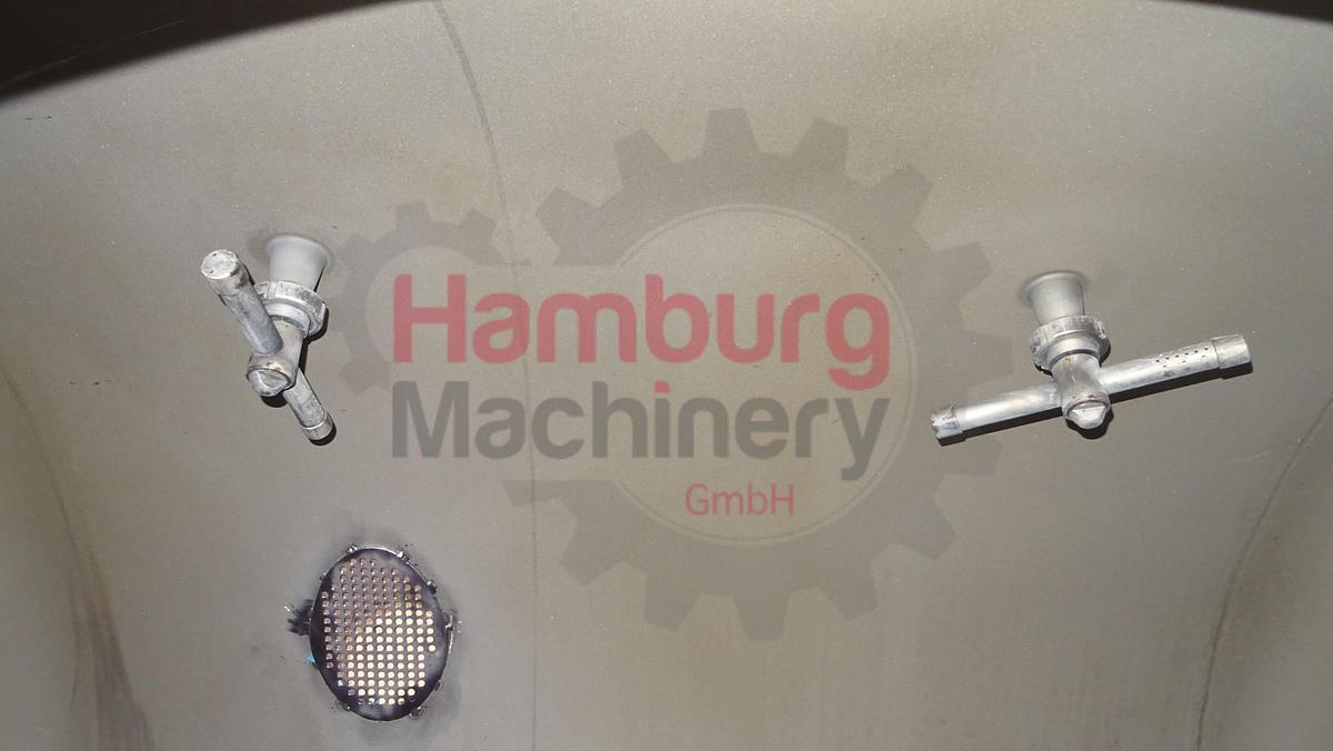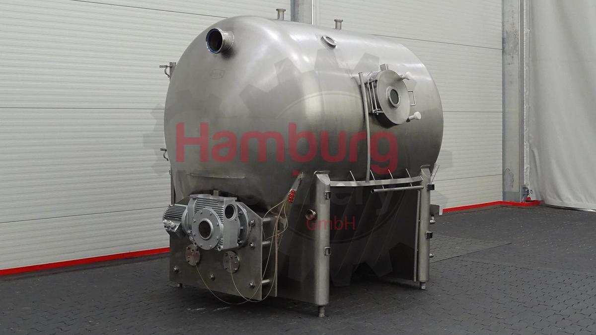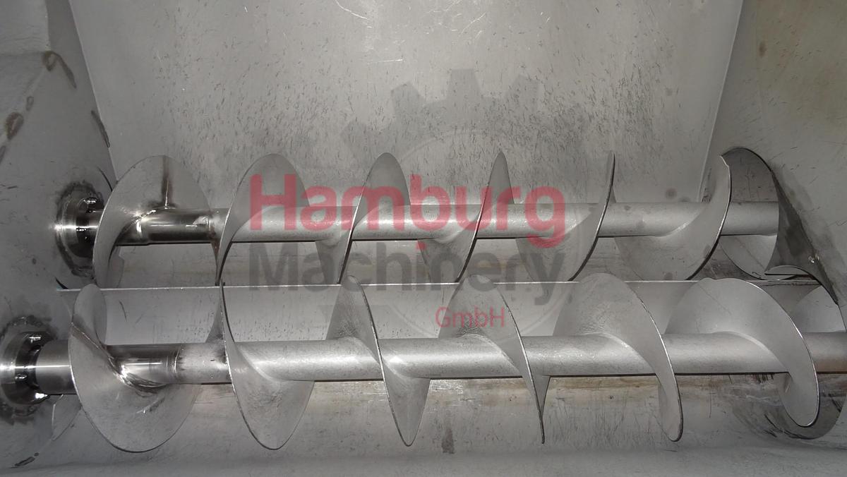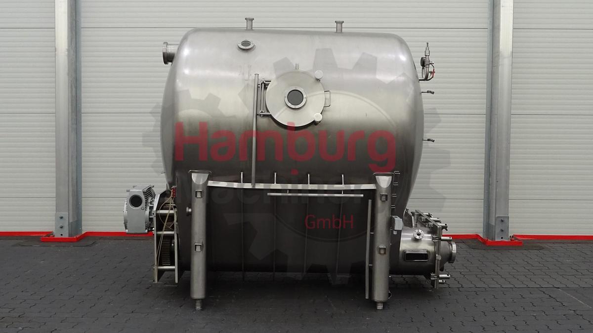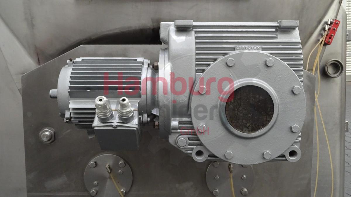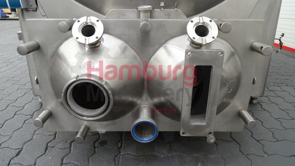 Geschlossenes Buttersilo aus Edelstahl. Einfach ummantelt. Vakuum am Silo möglich (Manometer 0 / - 1,0 bar). Das horizontale Puffersilo ist mit zwei Schnecken ausgestattet (angetrieben von einem Hauptmotor mit +/- 3 kW - 380 V - 50 Hz - 1.420 U/min - n2: 14 U/min, kein Namensschild am Motor, nur am Antrieb). Gesamtkapazität: 3.000 kg. Mannloch, rund, auf einer Seite und Schauglas auf derselben Seite. 1 Zulaufmöglichkeit für den direkten Anschluss des Auslaufrohrs einer kontinuierlichen Buttermaschine (CBM) auf der Rückseite und eine an der Seite des QHK-Buttersilos (DN100). CIP-reinigbar mit Sprühschale im Deckel. Auslaufplatte mit 1 rechteckigem Flansch und 1 rundem DN100-Flansch am Siloauslauf. Ohne Bedienfeld und Auslaufbutterpumpen., Maschinentyp: Buttersilo, Kapazität: 3.000 kg, Motor: +/- 3 kW – 380 V – 50 Hz – 1.420 U/min – n2: 14 U/min, Maße: ± 275 x 200 x 225 cm, Gewicht: ± 1,500 kg