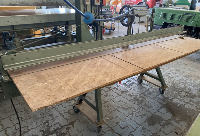 Furniersäge Scheer FM 8 - 3100 Schnittlänge 3100 mm Anschlagsystem mit Skala Absaugventilator Druckluftklemmung Gebrauchmaschine Zustand gut Preise: frei verladen zuzüglich MwSt.