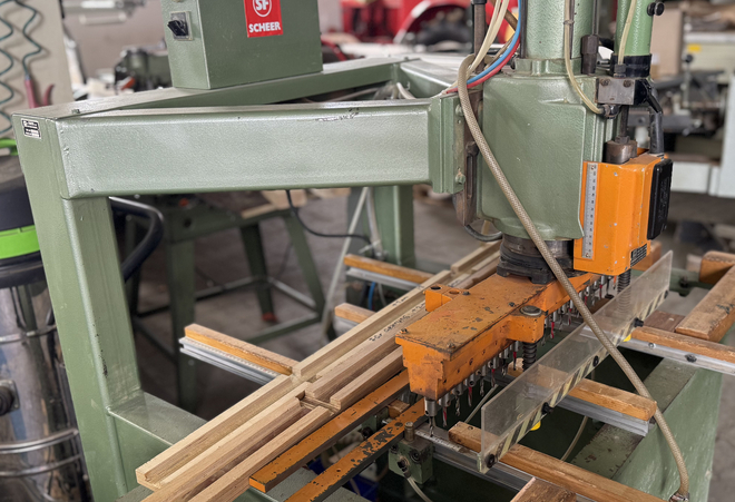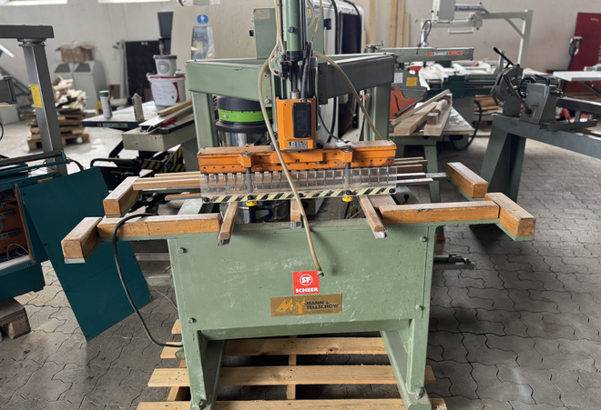 Hersteller: Scheer , Typ: DB 3000, Steuerung: Fusspedal, Bohrbalken schwenkbar: ja, Bohrspindelanzahl: 4, Lochraster: 32, Bohrmotor kW: 1,2, Bohrhub max mm: 80, Beleimwerkzeuge: nein, Dübel eintreiben: nein, Werkstückspannung: Pneumatisch, Pneumatikspanner: ja, Werkstückauflage: ja, Bearbeitungstationen: 2, Fussbedienung: ja, Achsenssteuerung für: nein, Bohrhöhe: 60, Gewicht ca. kg: 1000, Abeitsbreite 3000 mm,