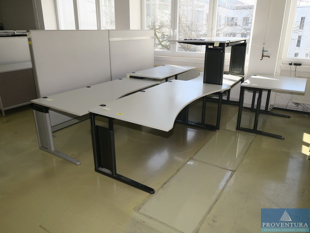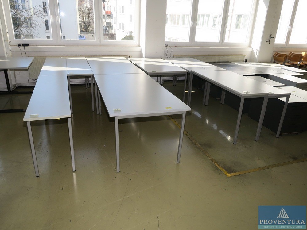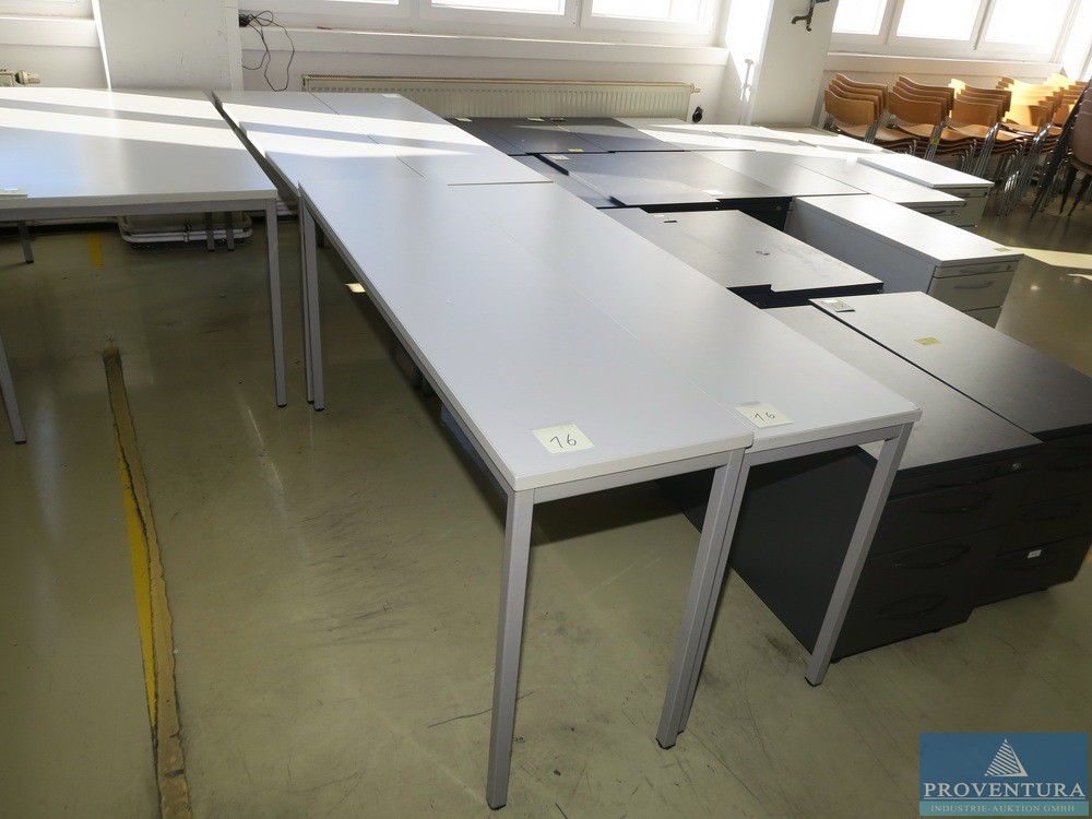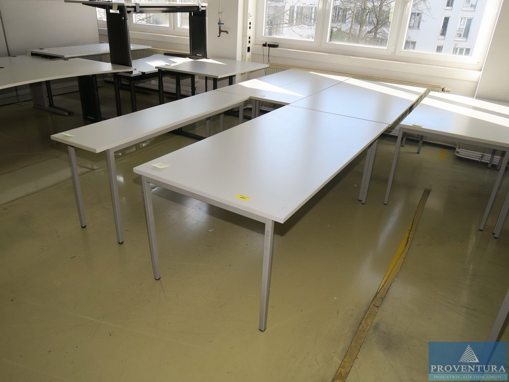 Schreibtische u. Ablagetische lichtgrau ca. 10 St., davon 3 St. je ca. 180x90 cm