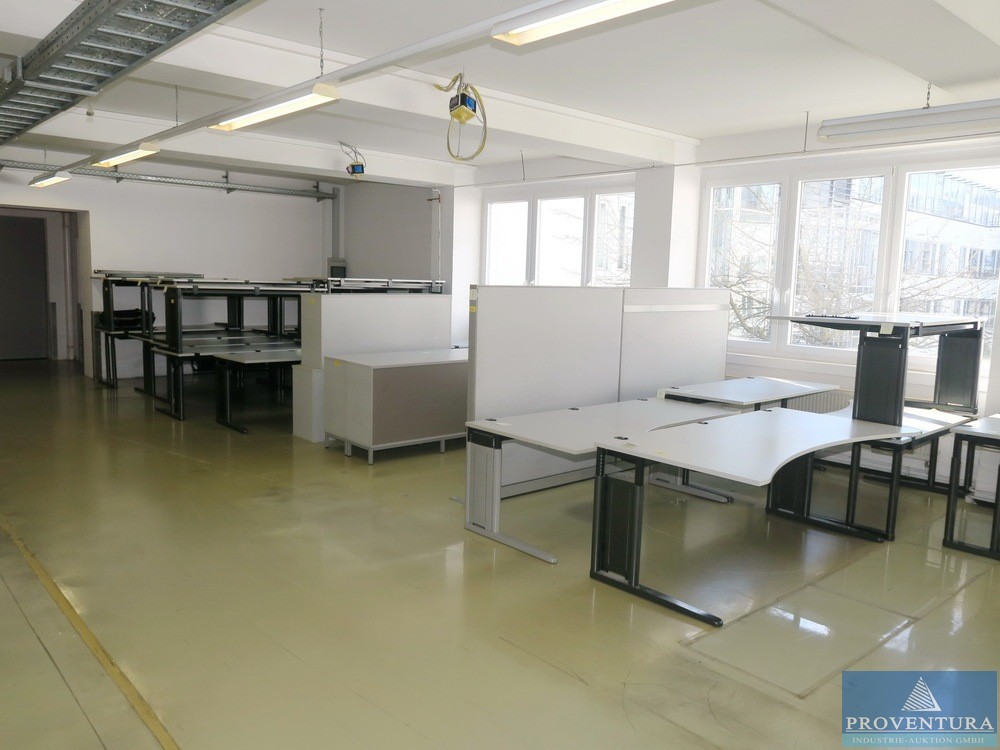 Schreibtische KÖNIG+NEURATH lichtgrau ca. 24 St., je ca. 180x80 cm, Gestell anthrazit, dazu 8 Sideboardschränke, 3 Schallschutzwände