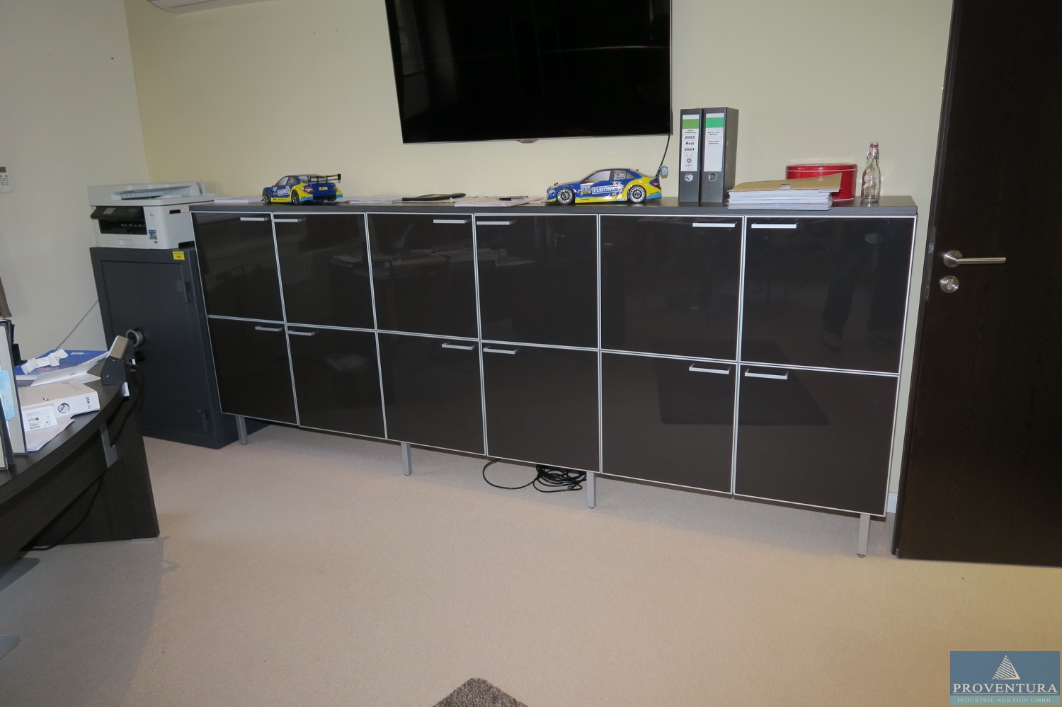 Mit Bürostuhl, Rolltür-Schrankgröße etwa 302x40xH144 cm und 1x Schublade. Auktions-ID: A1-44065-120