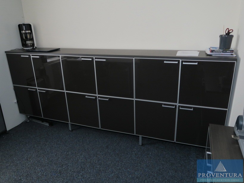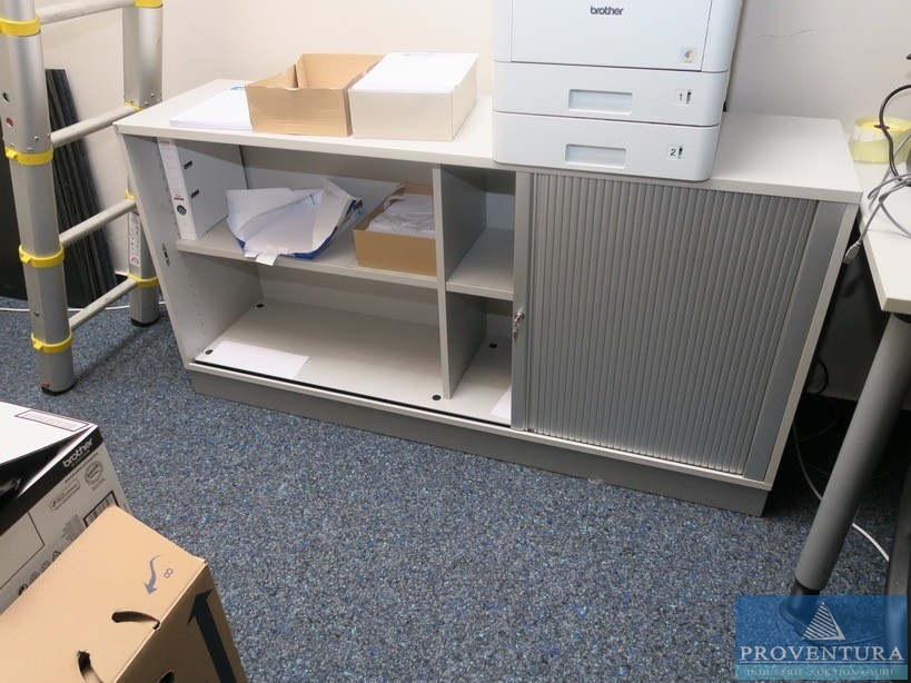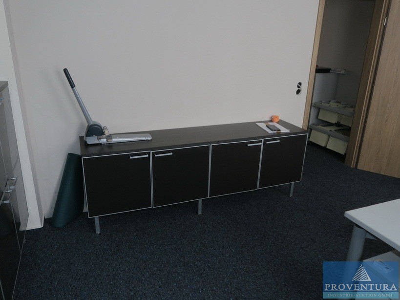 Büroausstattung best. aus Schreibtisch grau ca. 160x80x85cm (BxTxH), Rollcontainer grau, , Sideboard dunkelbraun, ca. 300x50x110cm (BxTxH), Sideboard dunkelbraun ca. 200x50x65cm (BxHxT), Kommode dunkelbraun, ca. 80x50x120cm (BxTxH), 1 Bürostuhl, 2 Besprechungsstühle
