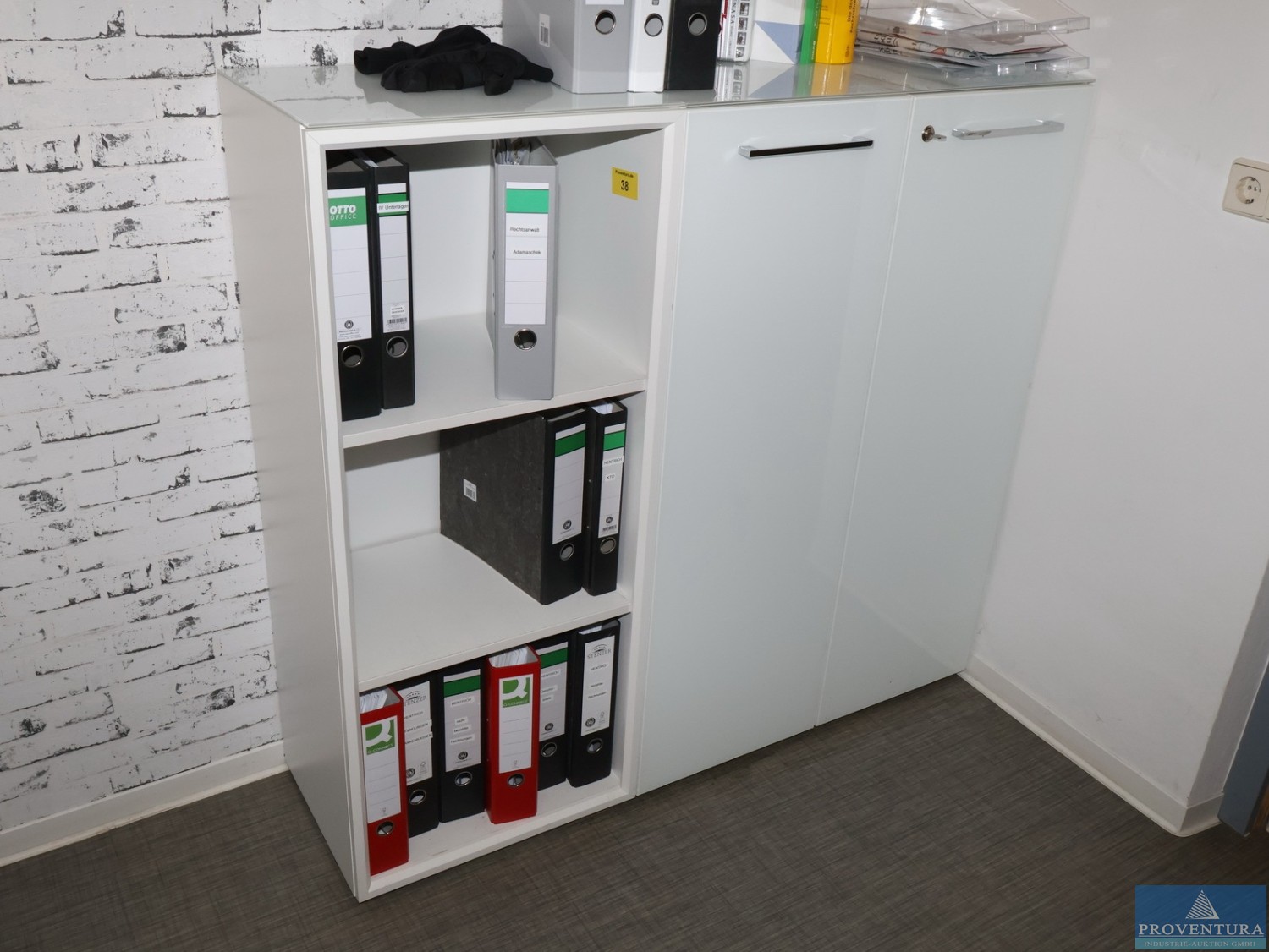 Mit 2x Bürostühlen, 2x Geka-Rolltürschränken in den Maßen 100x44xH87cm und 2 Schubladeneinheiten Auktions-ID: A1-44065-116