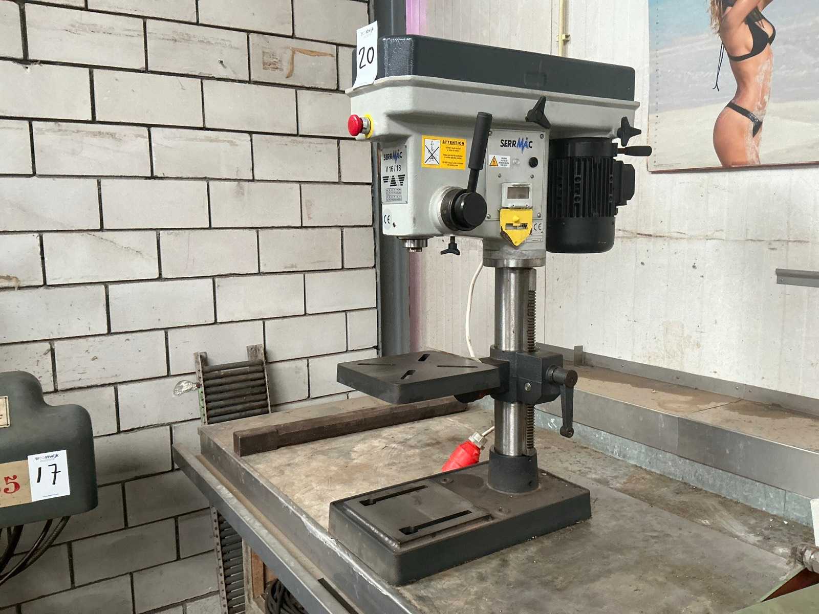 SerrMac Bohrmaschine TCO 28 Hersteller: SerrMac (Italien) Baujahr: 2002 Maschinentyp: Säulenbohrmaschine / Tischbohrmaschine Bohrdurchmesser (max.): 28 mm Bohrtiefe: 150 mm Ausladung: 300 mm Spindelaufnahme: Morsekonus MK3 Drehzahlbereiche: 205–325–1050 / 410–650–2100 U/min (über Riemenantrieb, 2 Gänge) Tischgröße: ca. 500 mm Länge Bauweise: massive Gusskonstruktion Antrieb: Riemenantrieb mit manueller Vorschubsteuerung
