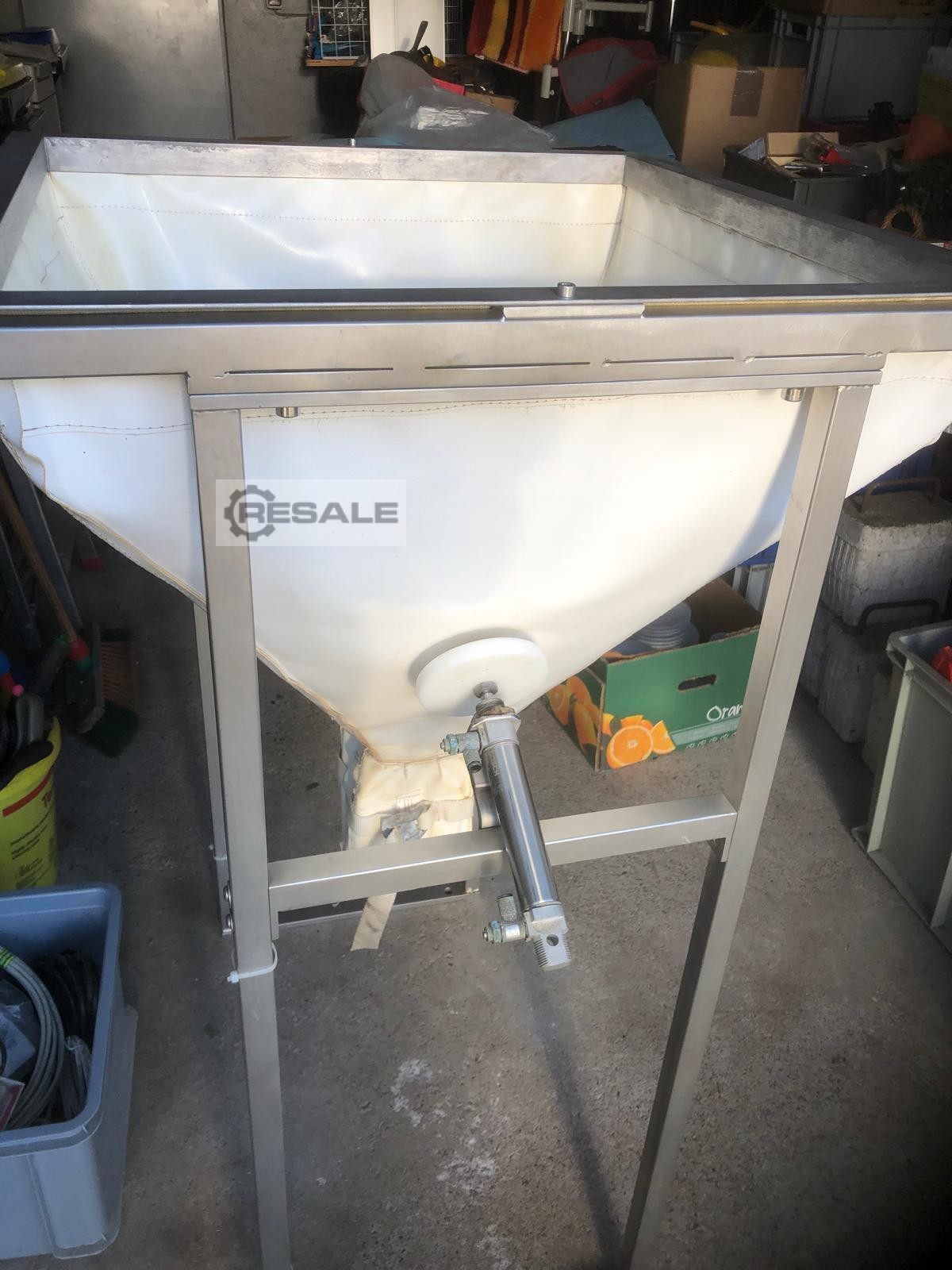 Mit Trichter, ca. 100 Liter, aus flexiblem Material und mit Punchern, um Brückenbildung im Trichter zu vermeiden.
