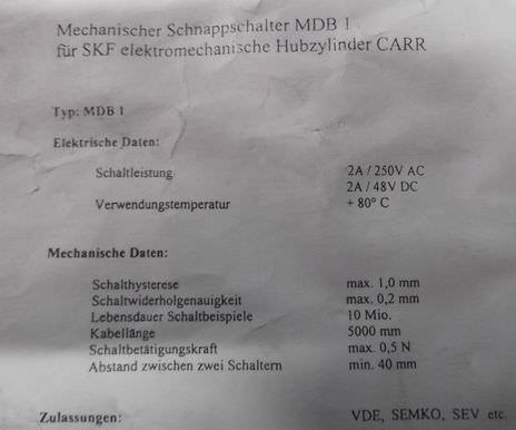 Mechanischer Schnappschalter MDB 1 für SKF elektromechanische Hubzylinder CARR, Schalter, Taster