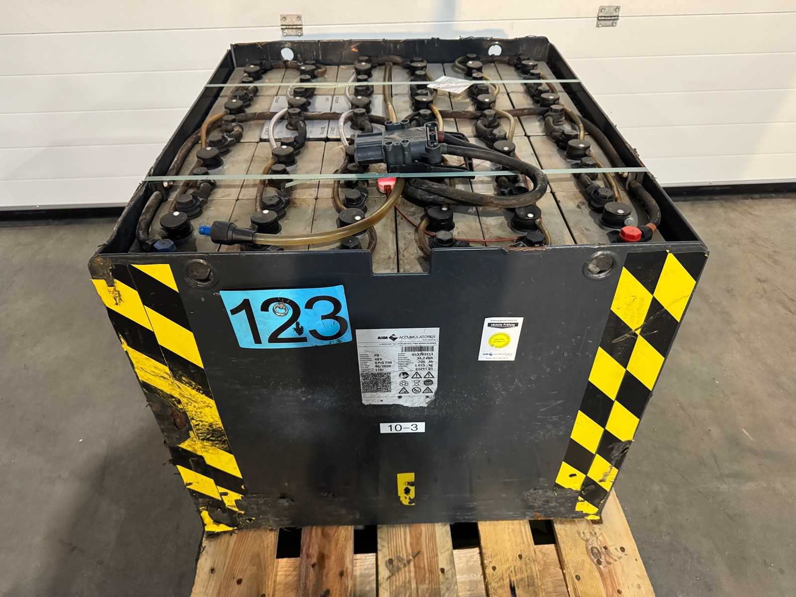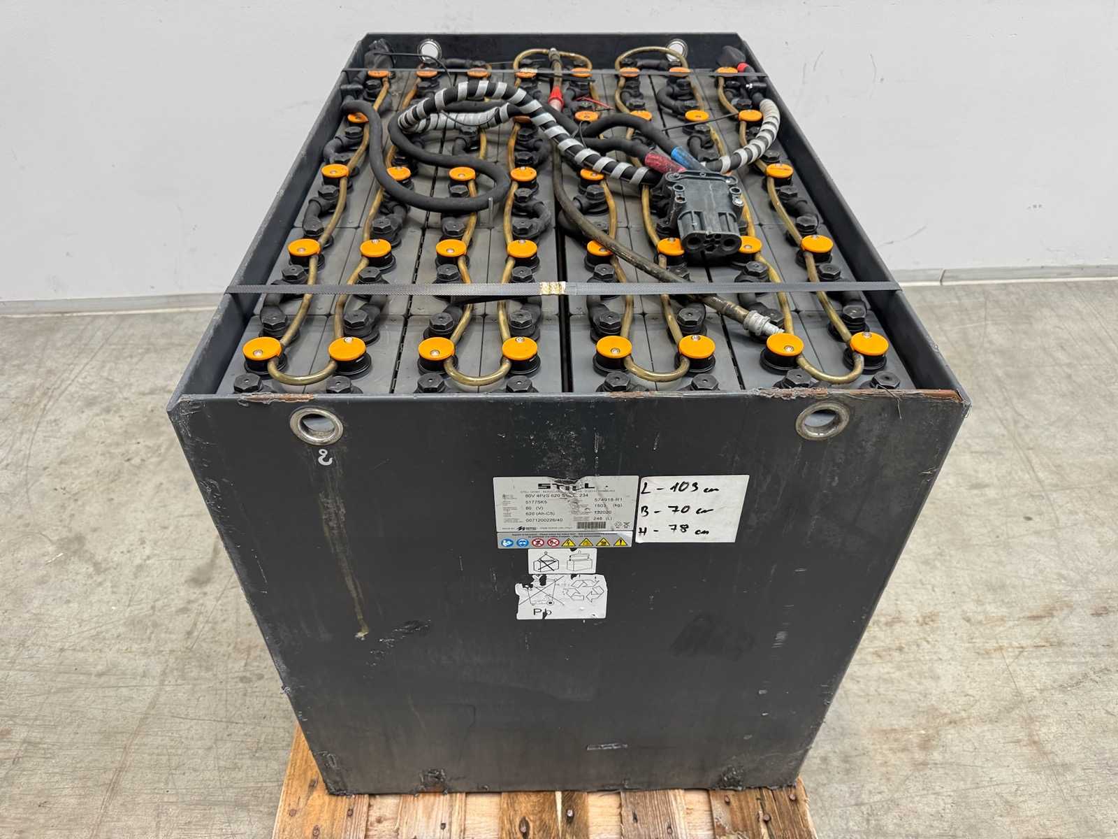 Batterie aus ehemaligem Linde Service 830x730x630mm Spannung im Ruhezustand ungeladen 51,23 V und somit noch sehr gut. Verladung auf LKW mit Gabelstapler. Lieferung per Spedition auf Anfrage möglich. Auktions-ID: A1-45450-1134
