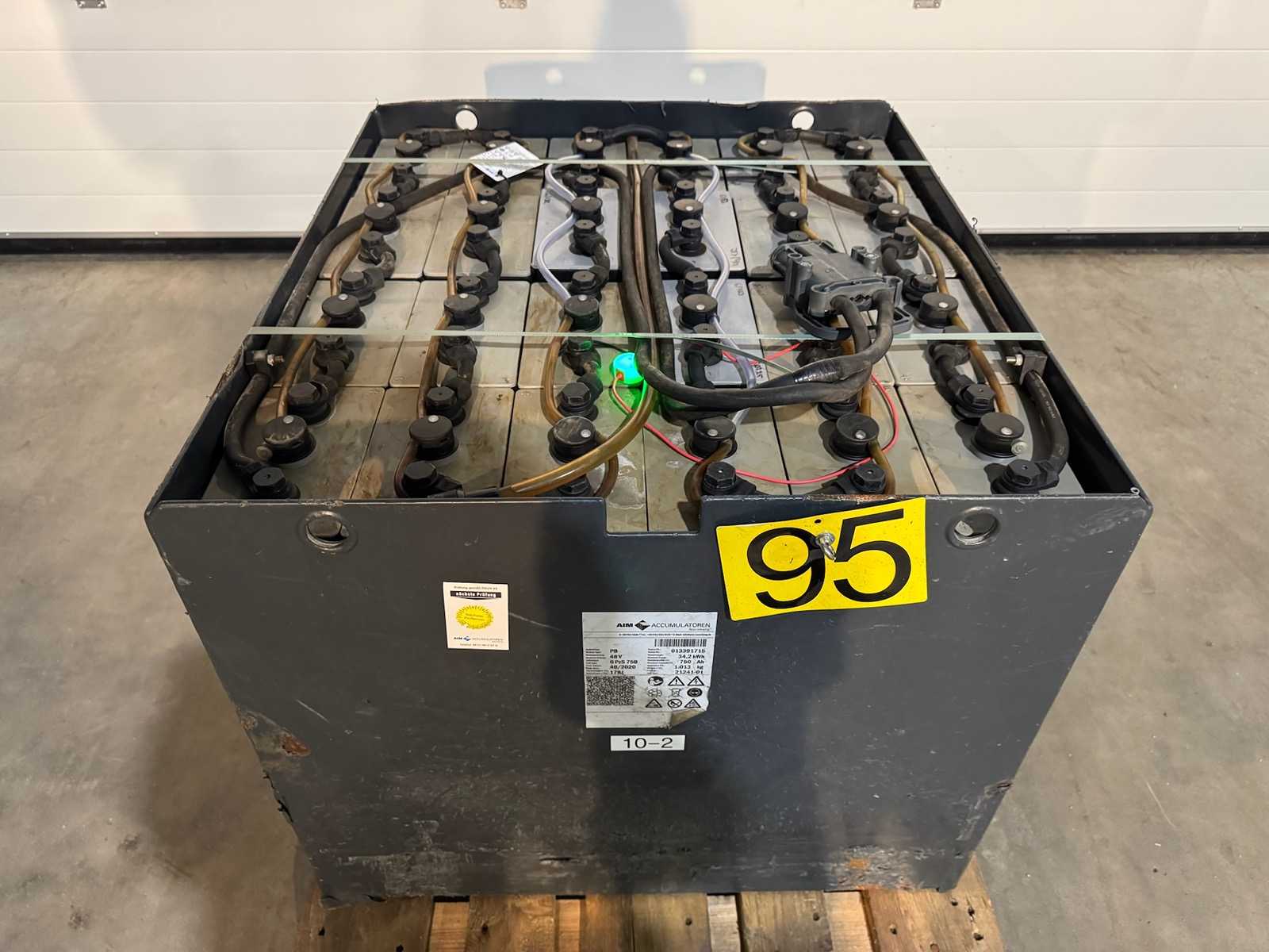 Batterie aus ehemaligem Linde Service 1030x1000x800mm Spannung im Ruhezustand ungeladen 84,54 V und somit noch sehr gut. Verladung auf LKW mit Gabelstapler. Lieferung per Spedition auf Anfrage möglich. Auktions-ID: A1-45450-1144
