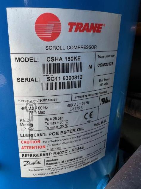 Trane Kaltwassersatz Mod.GN400E72D2XDDXX1, 102 KW, Bj. 2006, Kältemittel 407C, mit 3 Stk. Verdichter Scroll, mit Pumpe,