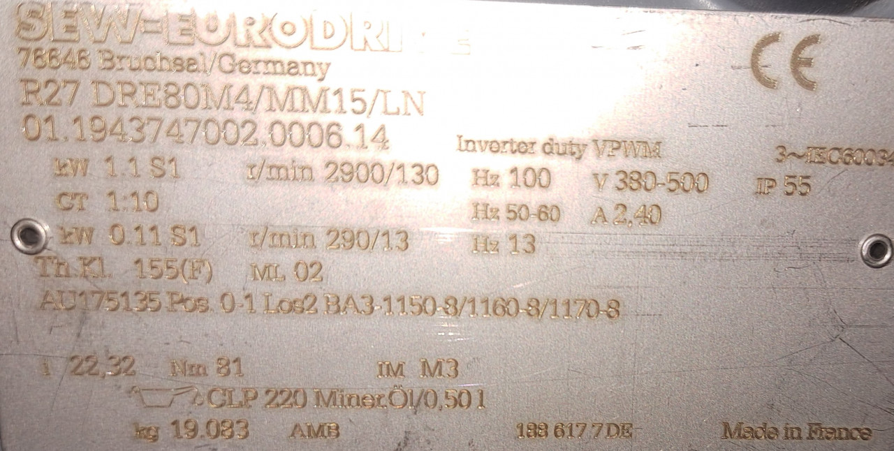 Antrieb: SEW Getriebemotor, R27 DRE80M4/MM15/LN