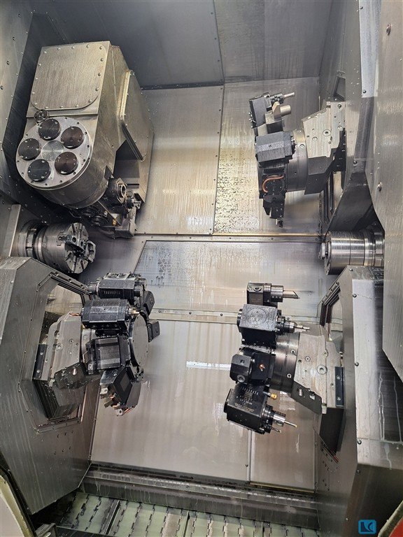 Drehlänge: 450mm, Spindeldurchlass: 65mm, Drehzahl: 4000U/min, Leistung Hauptspindel/Gegenspindel: 18,5kW/11kW, Werkzeugplätze: 10, angetriebene Werkzeuge: 10, Hydraulikkapazität: 150l, Hydraulikdruck: 60bar, Anschlussleistung: 39kW. Eilgang X1/X2: 15m/min, Vorschubkraft: 5000N, Vorschubweg: 140mm. Eilgang Z1/Z2: 30m/min, Vorschubkraft: 8000N, Vorschubweg: 450mm. Eilgang Y1: 6m/min, Vorschubkraft: 8000N, Vorschubweg: +/-35mm. Maschinendimensionen X/Y/Z: ca. 4150mm/2000mm/1800mm, Gewicht: ca. 4750kg, Steuerung: Traub System TX 8F, Betriebsstunden: 78825h. Dokumentation vorhanden. Eine Besichtigung vor Ort ist möglich.