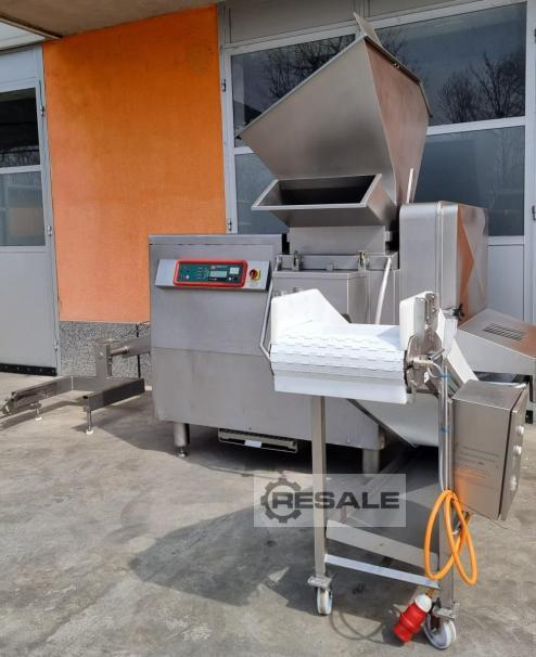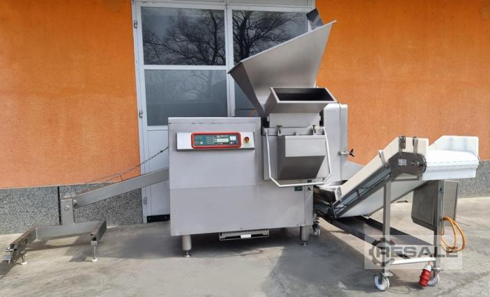 Gebrauchte TREIF CUBEMAT CE Automatic dicer. Typ: CE 120 Ladebereich (LxBxH): 550 x 120 х 120 mm Schnittlänge: 0,5 – 34 mm Sägeblätter: 1 Satz 20 x 20 mm Mit Heber für 200L Fleischbehälter Elektrische Ausrüstung: Elektronische Steuerung Produktivität ca.: 3000 kg/Stunde Abmessungen der Maschine: Breite: 1700 mm (mit Band 3200) Länge: 3900 mm Höhe: 2600 mm Installierte Leistung: 6,2 kW Stromversorgung: 400 V, 50 Hz Gewicht (inkl. 1 Schneidsatz): 1800 kg