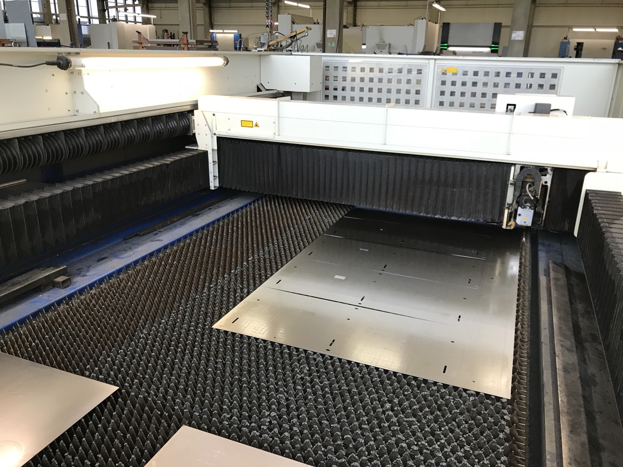 Betriebsstunden Laser ein: 50921 h Betriebsstunden Strahl ein: 21717 h Laserleistung: 3200 Watt Arbeitsbereich Laserbetrieb: 4000 x 2000 x 115 mm Max. Baustahl: 20 mm Max. Edelstahl: 12 mm Max. Aluminium: 8 mm Länge: 11600 mm Breite: 5300 mm Höhe: 2200 mm Gewicht Maschine : 16000 kg Gesamtanschlusswert: 73 kVA