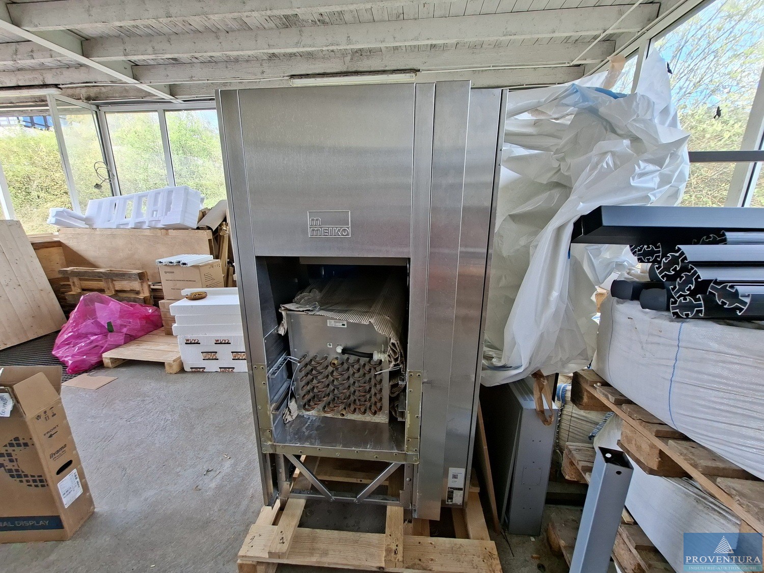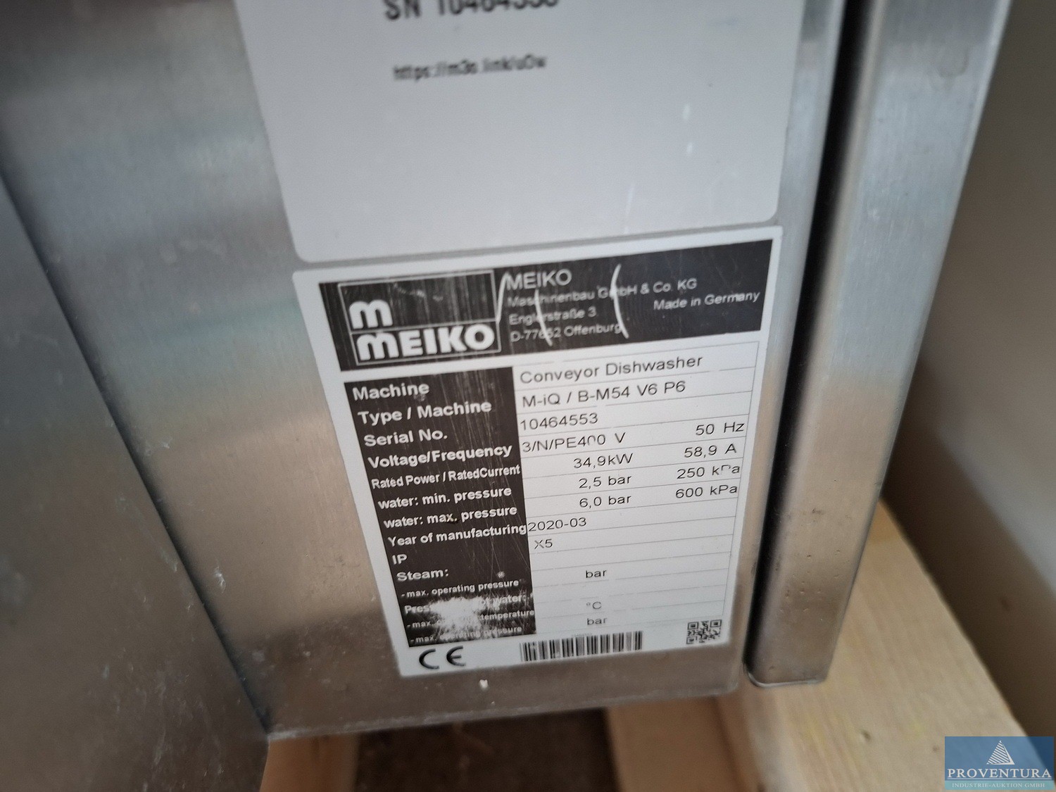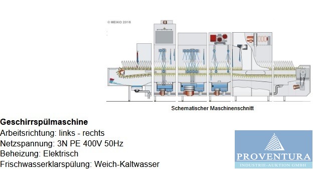 Bandspülmaschine MEIKO M-IQ B-M54 V6 P6 angeschafft 09.2020 für ca. 49.500 ? netto, Maschinenlänge 5.500 mm, Tellerleistung ca. 2.400 Teller/h, Maschinentransportband MTB 1.11-2, Netzspannung: 3N PE 400V 50 Hz, Norminalleistung ca. 33,7 kW, Frischwasserklarspülung 165 l/h, Tankfüllung ca. 206 l, Regenerationswassermenge ca. 75 l/h, Abmessungen der Maschine Maschineneinlauf (E) ca. 1.200 mm, Vorabräumung (WTV) 600 mm, Waschtank (HWZ A) 800 mm, Pumpenklarspülung (P) 600 mm, 1. Trocknung (TR) 1.100 mm, Maschinenauslauf (A) 1.000 mm, Achtung: Die Warenaus-/Übergabe erfolgt AUF der Laderampe! Zur Abholung ist ein Fahrzeug mit Hebebühne oder ein Fahrzeug mit Hubwagen erforderlich (LKW mit max. 7,5t - größere / längere LKWs setzen ggf. auf!). Bei allen anderen Fahrzeugen benötigen Sie genug kräftige Personen oder entsprechende Rampen zum Herunterheben / Transportieren / Einladen d ...