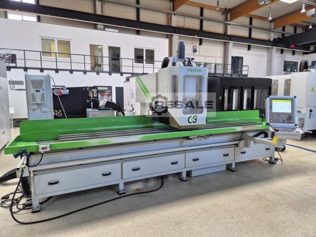 Gebrauchte Urban BZ 7000. Bearbeitungszentrum CNC von Urban Steuerung: Heidenhain Bahnsteuerung iTNC 530 4-Achsen Verfahrwege x/y/z – Achse 7200 /450 /590 mm Arbeitsbereich x/y/z- Achse 7000 / 400 /350 mm Gewicht 14 t Ausstattung: Robuster Grundaufbau als Schweißrahmenkonstruktion Kugelschienenführung an sämtlichen Achsen Frässpindeleinheit: 100-12000 U/min, werkzeugaufnahme SK 40 Antriebe: X-Achse 50 m/min durch Zahnstangenantrieb Y/Z-Achse 25m/min durch Kugelumlaufspindel B-Achse 9000°/min Bedienpult schwenkbar Automatische Zentralschmierung Mitfahrender Werkzeugwechsler für 12 Werkzeughalter SK40 Kühlemulsionsanlage, Maschineleute, Sicherheitszaun Elektronisches Handrad in das steuerpult integriert Späneschubladen, Laserscanner, minimalmengenschmierung Technische Daten siehe Bilder.