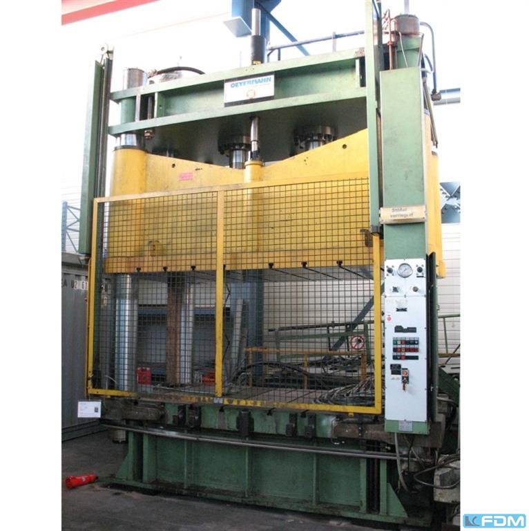 Druck: 1000 t Ständerweite: 3030 mm Hub: 350 mm Entfernung Tisch/Stößel, gr. Hub oben, Verst. oben: 1400 mm Tischfläche: 3000 x 2000 mm Tischhöhe über Flur: 430 mm seitlicher Ständerdurchgang: 1450 x 1400 mm Stößelfläche: 3000 x 2000 mm Geschwindigkeit ab: 300 mm/s Geschwindigkeit auf: 340 mm/s Arbeitsgeschwindigkeit: 18 - 44 mm/s Rückzugskraft: 120 t Ölinhalt: 4400 l Breite mit Bühne: 4950 mm Antriebsleistung: 2 x 90,0 + 10,0 kW Gewicht: 87,0 t Raumbedarf (BxTxH): 4,35 x 3,65 x 7,55 m Höhe über Flur: 6,05 m Höhe unter Flur: 1,5 m UVV: für Handeinlegearbeiten zugelassen: UVV 11.064 - VBG 7n5.2