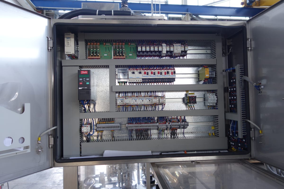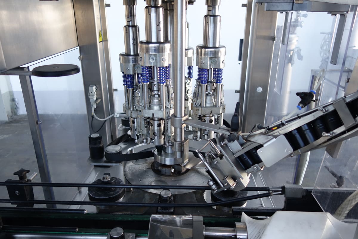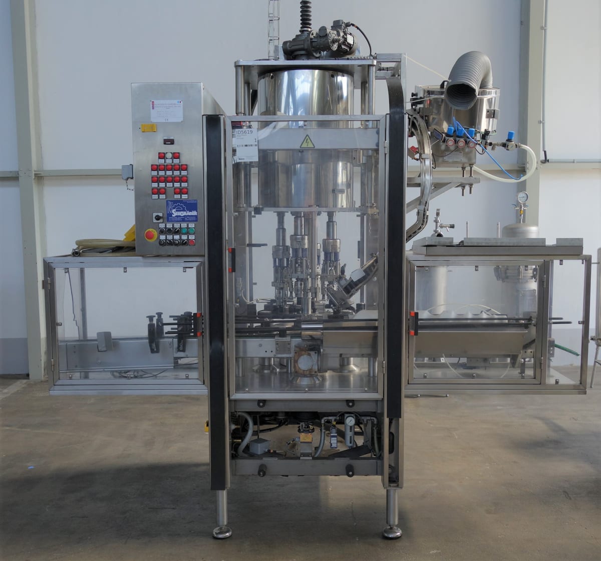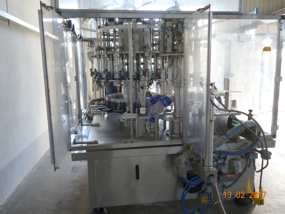 Sie stammt aus einer bedeutenden pharmazeutischen Produktionsstätte in Europa und befindet sich in ausgezeichnetem Gesamtzustand – gut gepflegt und regelmäßig gewartet. Arbeitsbeschreibung: Automatischer rotierender 3-Kopf-Kondensator mit einer Leistung von bis zu 90 Kapseln pro Minute (je nach Deckeltyp und verarbeiteter Flasche). Edelstahl, vollständig geschützte Konstruktion, zuletzt verwendet mit Dosen mit 29,5 mm Durchmesser und Kappen bei 27,5 mm sowie 32 mm Durchmesser + 16 mm Kappenhöhe. Edelstahl-Sortierer mit 720mm DIA-Rotationskapsel und Plexiglas-Abdeckung und -Deckel. Kommt mit zwei zusätzlichen Sets von Formatteilen, darunter Sternrad und Führungen; geeignet für Pharmazeutik, Kosmetik, Ernährung, Vertragsfertigung, Lebensmittel, Medizinprodukte, Chemie und andere. Technische Informationen: Größe (Maschine): L: 3000mm x B: 1300mm x H: 1800mm  ...