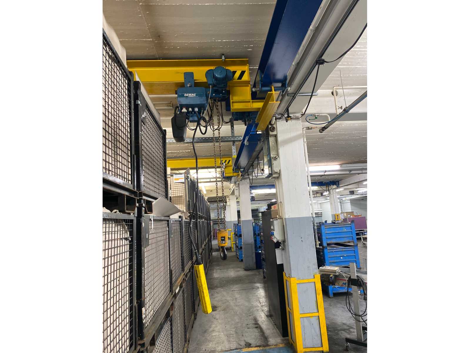 Tragfähigkeit: 800 kg Spannweite: 5740 mm Portalhöhe: 4700 mm lichte Breite: 5500 mm Radstand: 3000 mm Bauhöhe: 5100 mm mit Elektrozug ELEKTROLIFT, Baujahr 2022: Tragkraft: 800 kg Hubgeschwindigkeit: 6 m/min Feinhub: 1,5 m/min