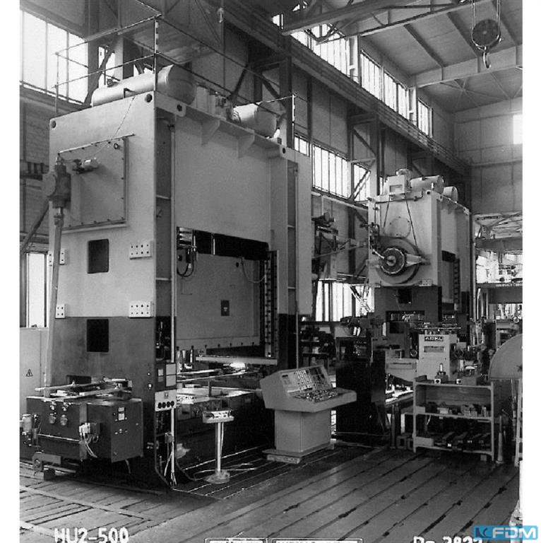 Druck: 1000 t Ständerweite: 5000 mm Hub: 500 mm Spitzenhöhe: 400 mm Motorleistung: kW Drehzahl(en): U/min Maschinenabmessungen: 6000 x 2500 mm Gewicht: 1000 kg Spitzenweite: 3500 mm Gesamtleistungsbedarf: kW Maschinengewicht ca.: 220 t Raumbedarf ca.: m Hydraulische 1.000 to Presse Tischgröße 3500 x 2200 mm Abstand zwischen Tisch und Stößel: min ca. 400 mm / max. ca. 1580 mm Ziehkissen im Tisch mit 500 mm Hub und 300 to Gegenkraft Außenabmessungen ca. 6000 x 2500 mm Höhe ca. 8500 mm (über Flur) Kellertiefe (für Hydraulik und andere Aggregate): ca. 5000 mm Gesamtgewicht ca. 220 to, das schwerste Einzelteil ist das Kopfstück mit ca. 64 to Steuerung Siemens Da sie über eine Schnittschlagdämpfung verfügt, kann sie auch zum Stanzen(Schneiden) genutzt werden. Die seitlichen Ständer haben Durchlässe von ca. 1.100 mm Breite. Somit können Stanzwerkzeuge auch von beiden Seiten mi ...