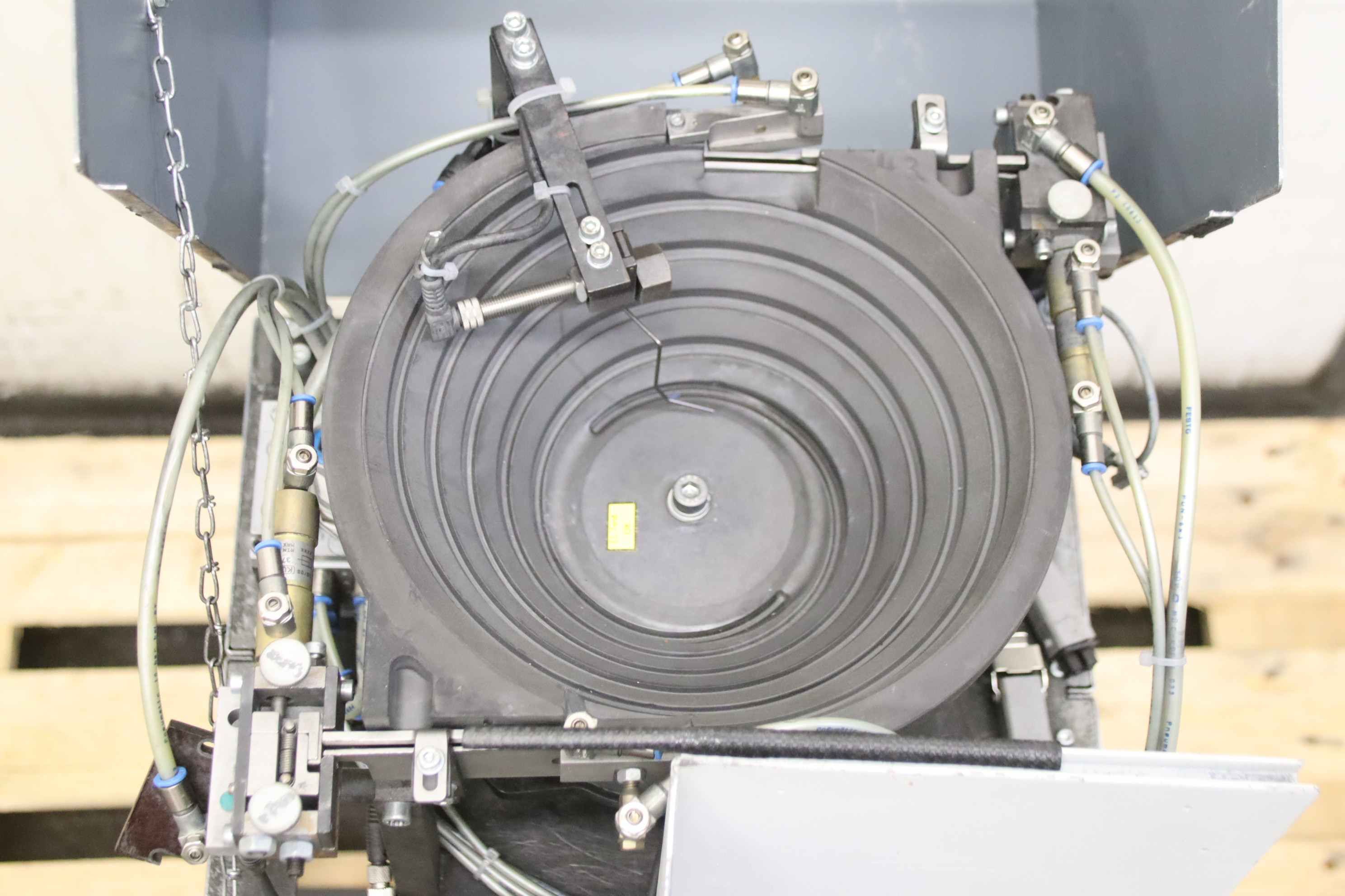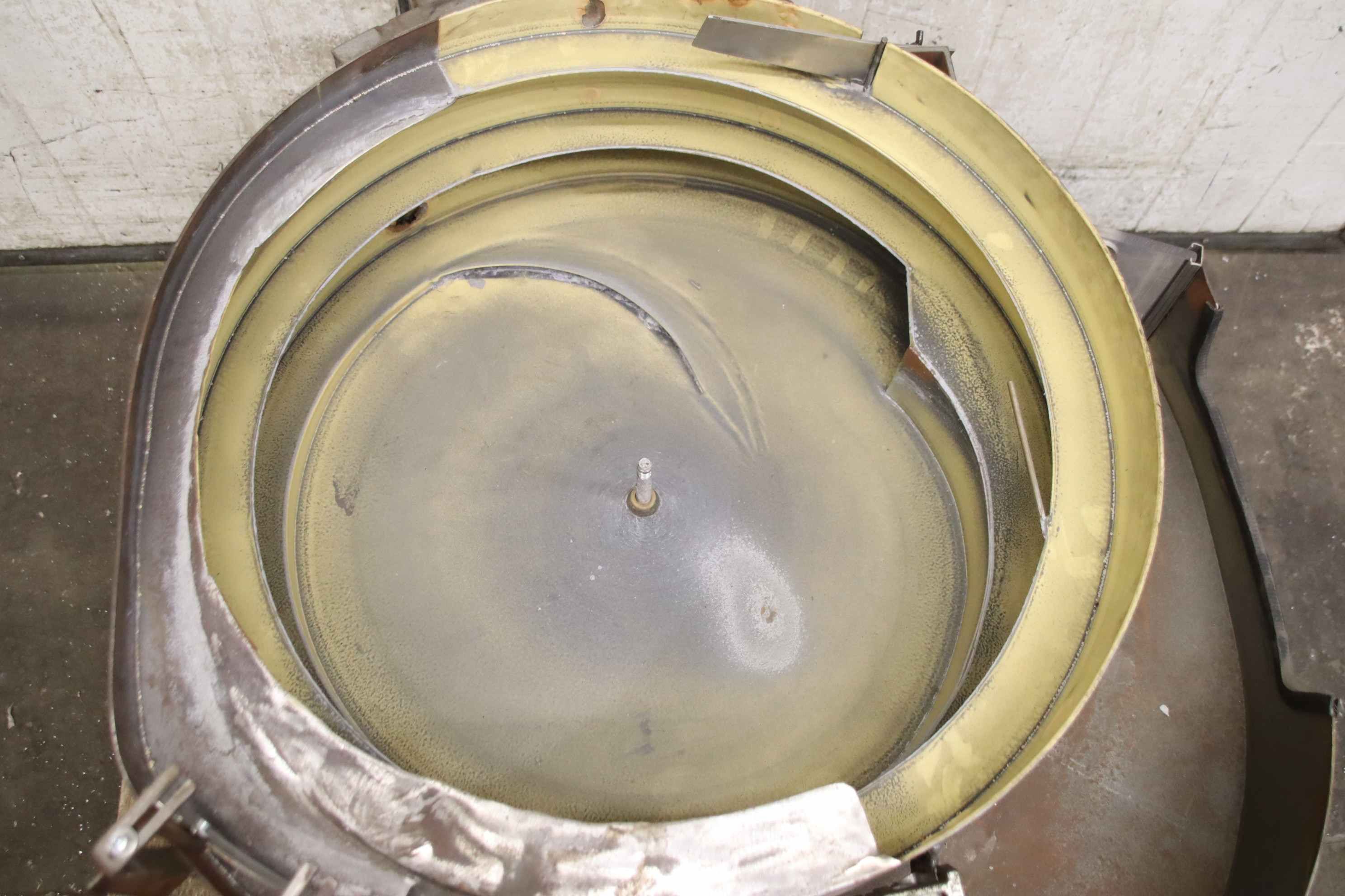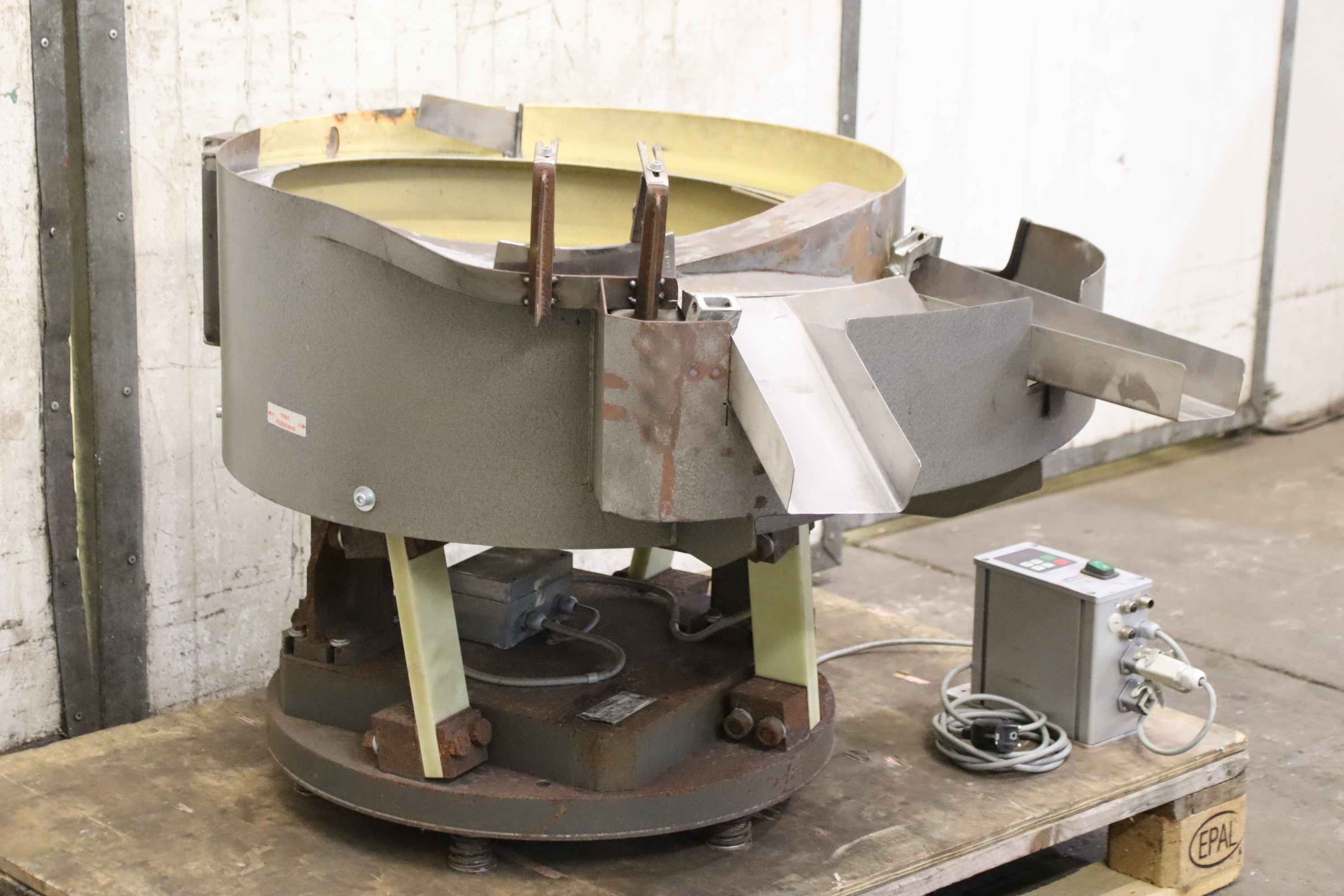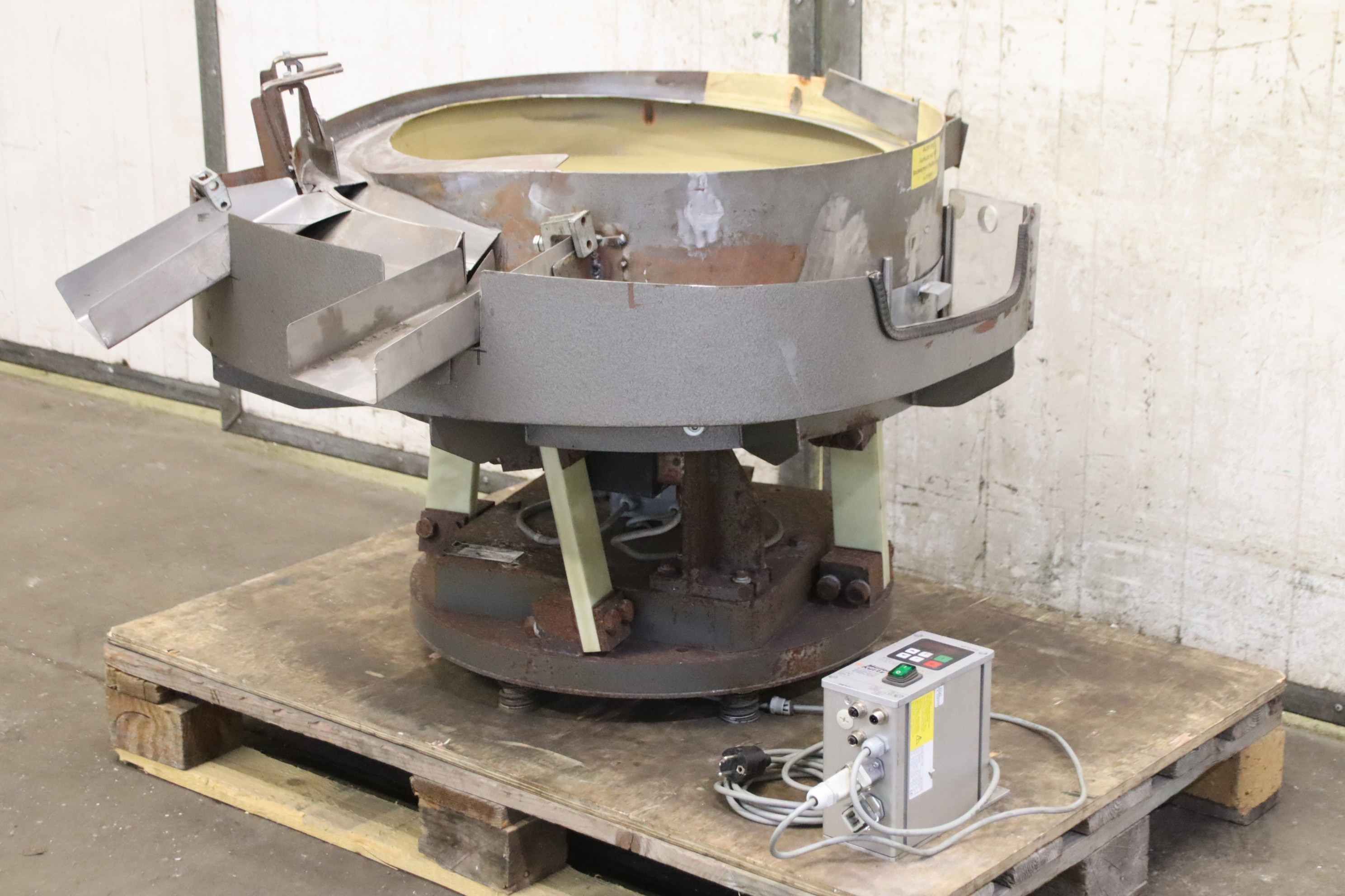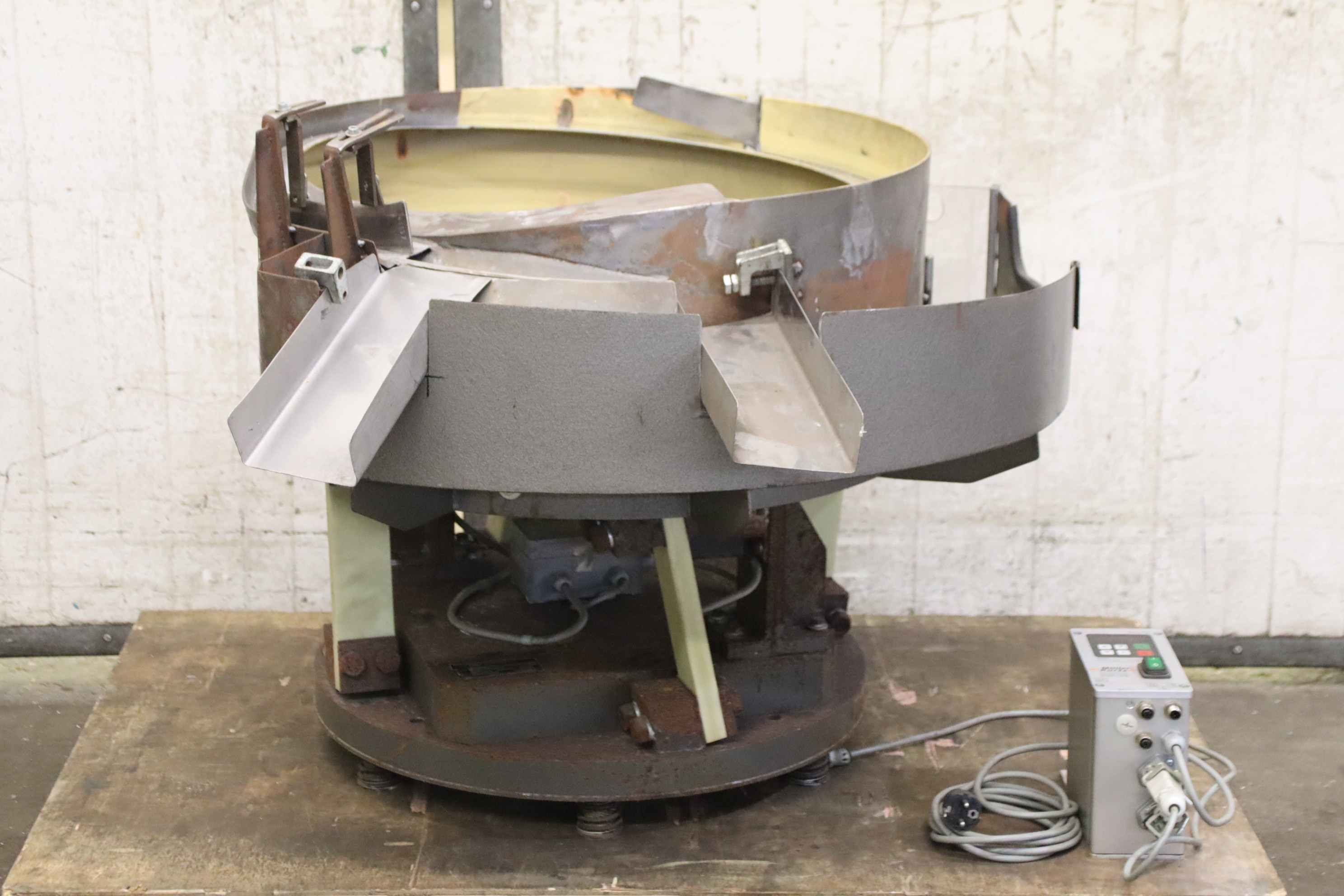 Vibrationsförderer, Schwingförderer, Vibrationszufuhrgerät, Zuführgerät, Voratsbehälter mit automatischer Zuführung, Wendelförderer -Hersteller: Oku Automatik, Wendelförderer Vibrationszufuhrgerät mit Frequenzeuerung -Typ: VZ 1000 S-R -Frequenzumrichter: Müller Kurtz MFS 168 -Arbeitsbecken: Ø 670 mm -Auslassbreite: 300 mm -Arbeitsbeckenhöhe: 245 mm -Wendelförderer: elastisch gelagert -Anschluss: 230 Volt -Transportabmessung: 1070/810/H730 mm -Gewicht ges.: 293 kg
