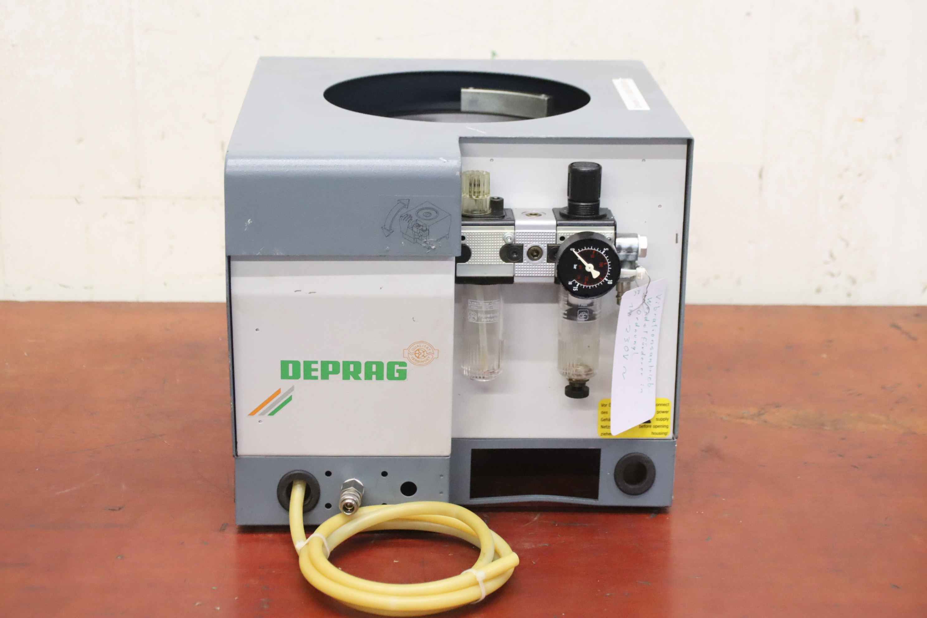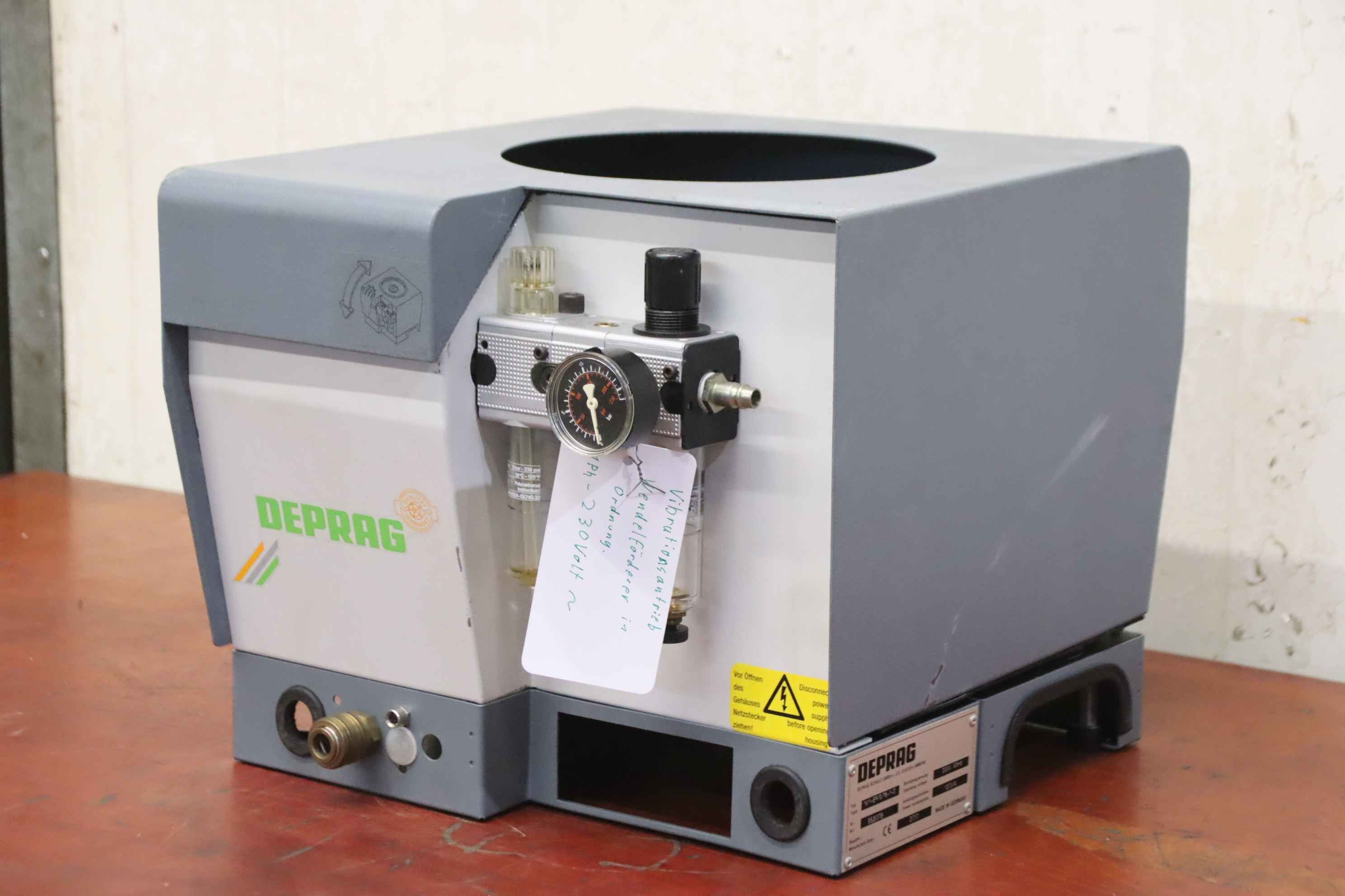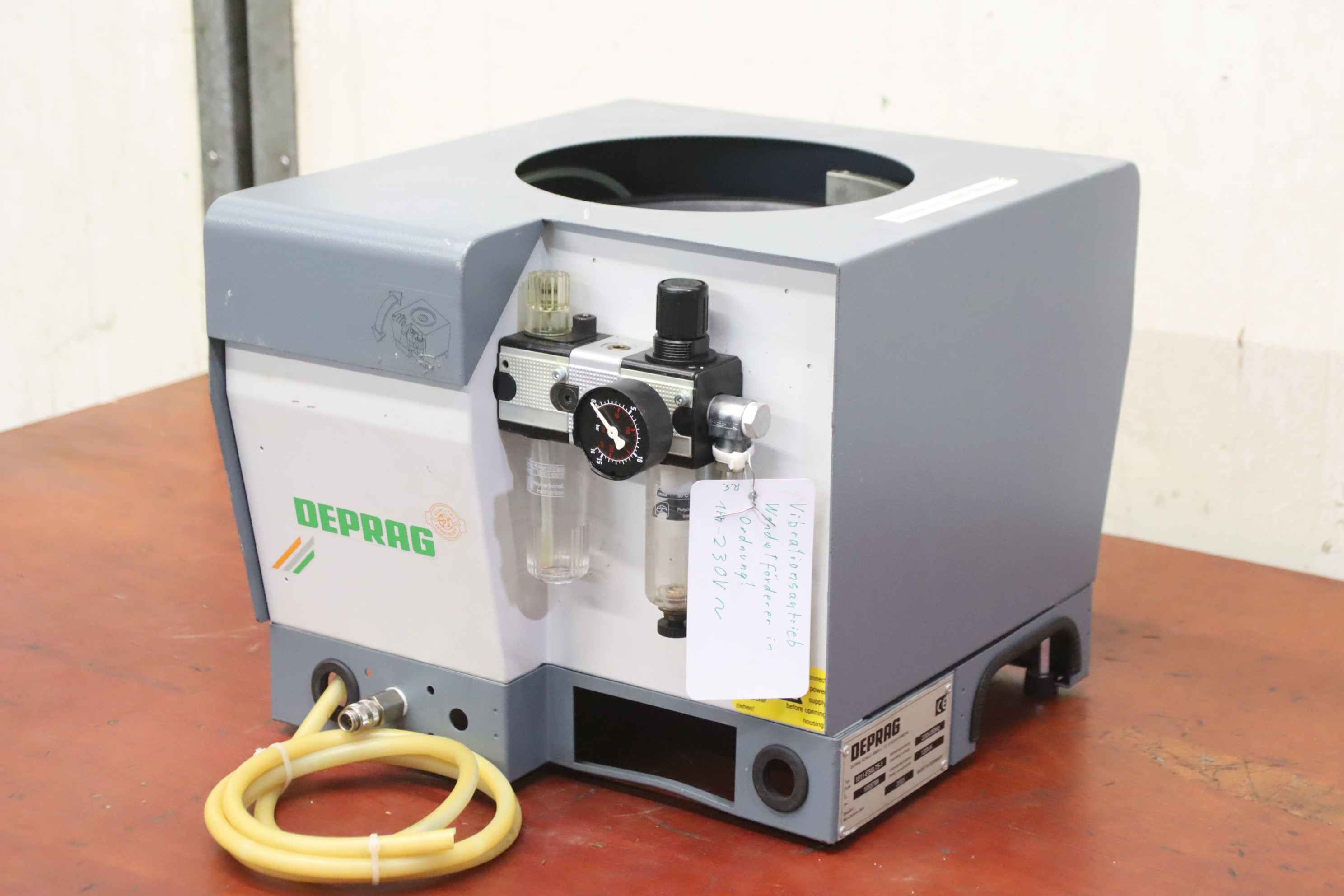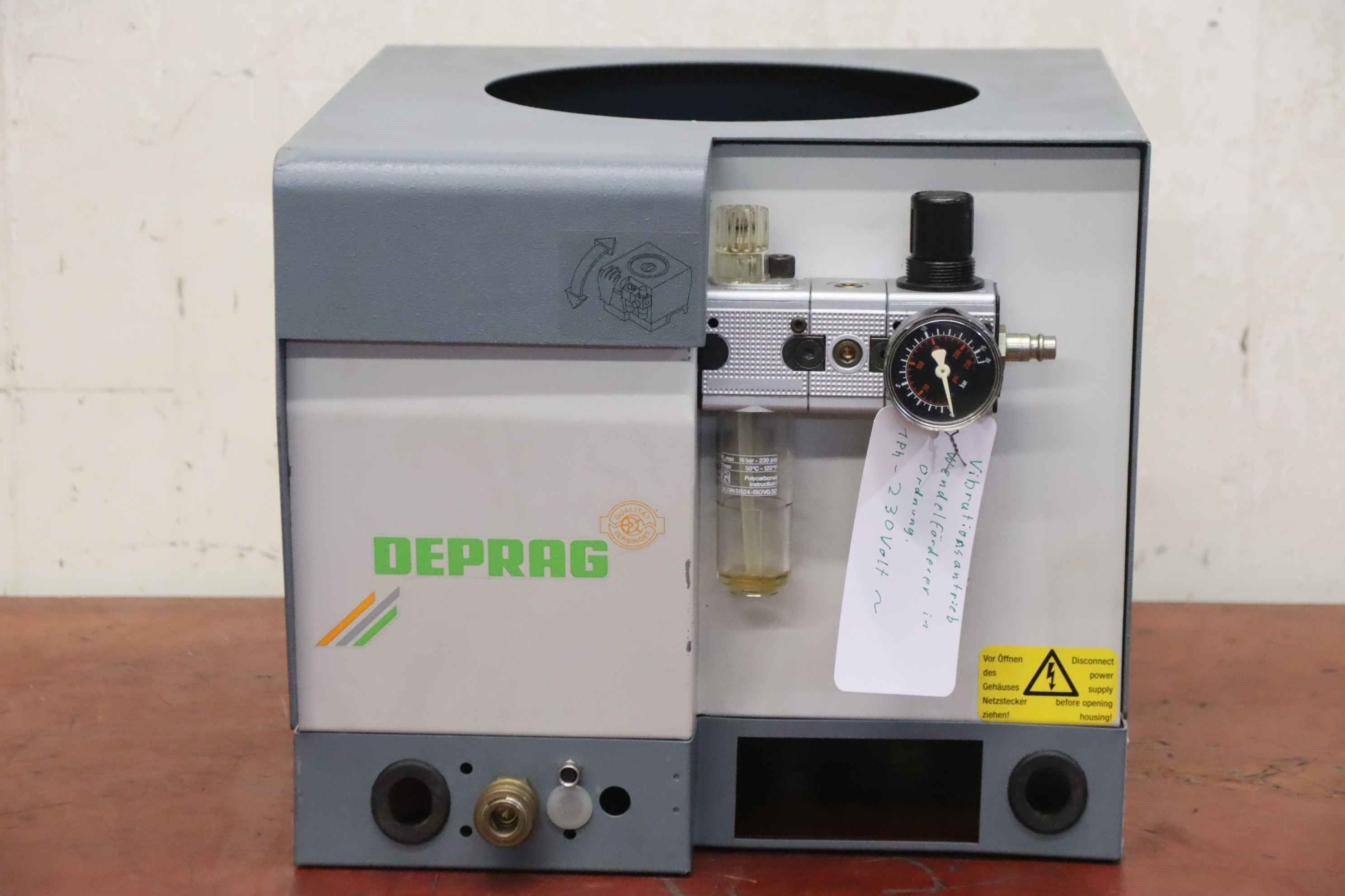 Vibrationsförderer, Schwingförderer, Vibrationszufuhrgerät, Zuführgerät, Wendelförderer, Vibrationsfüller, Vibrationswendelförderer, Vibrationsdosierer -Übergabe: im Ist-Zustand wie besichtigt -Gehäuse: Abdeckung fehlt -Hersteller: Deprag, Wendelförderer Vibrationsförderer -Typ: 1511-ES/0.75-1 -Anschluss: 230 Volt -Transportabmessung: 415/360/H325 mm -Gewicht: 23 kg