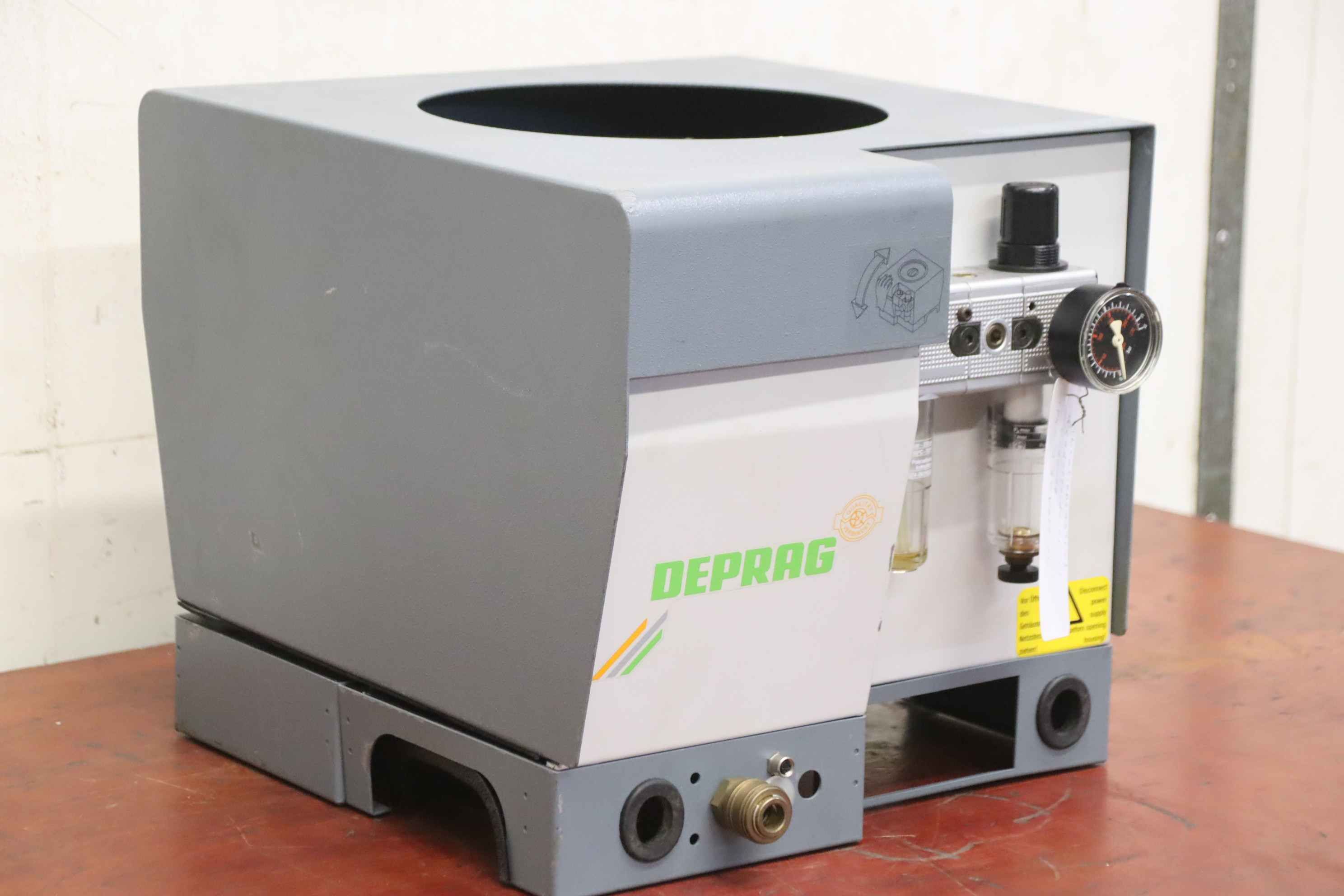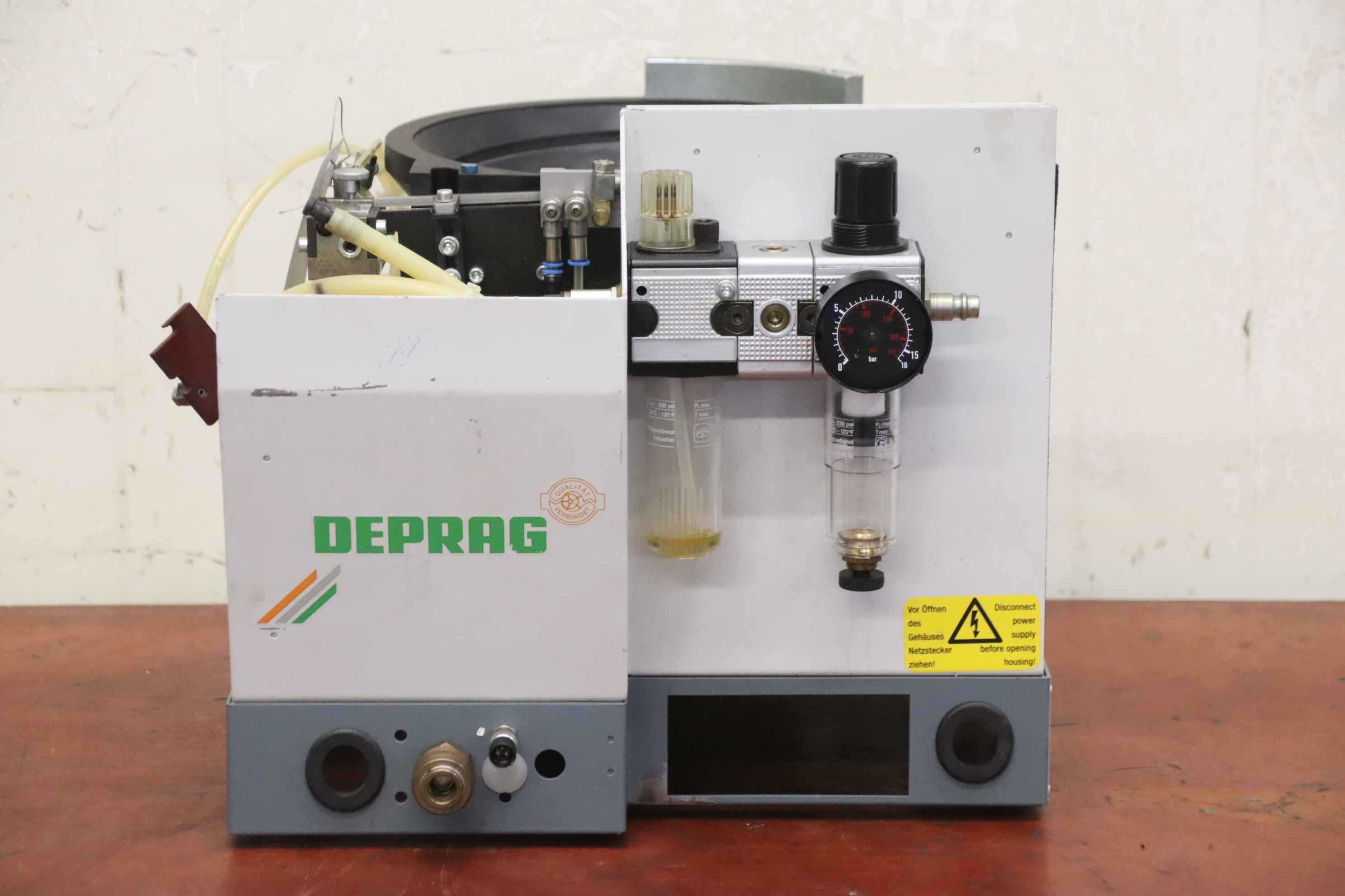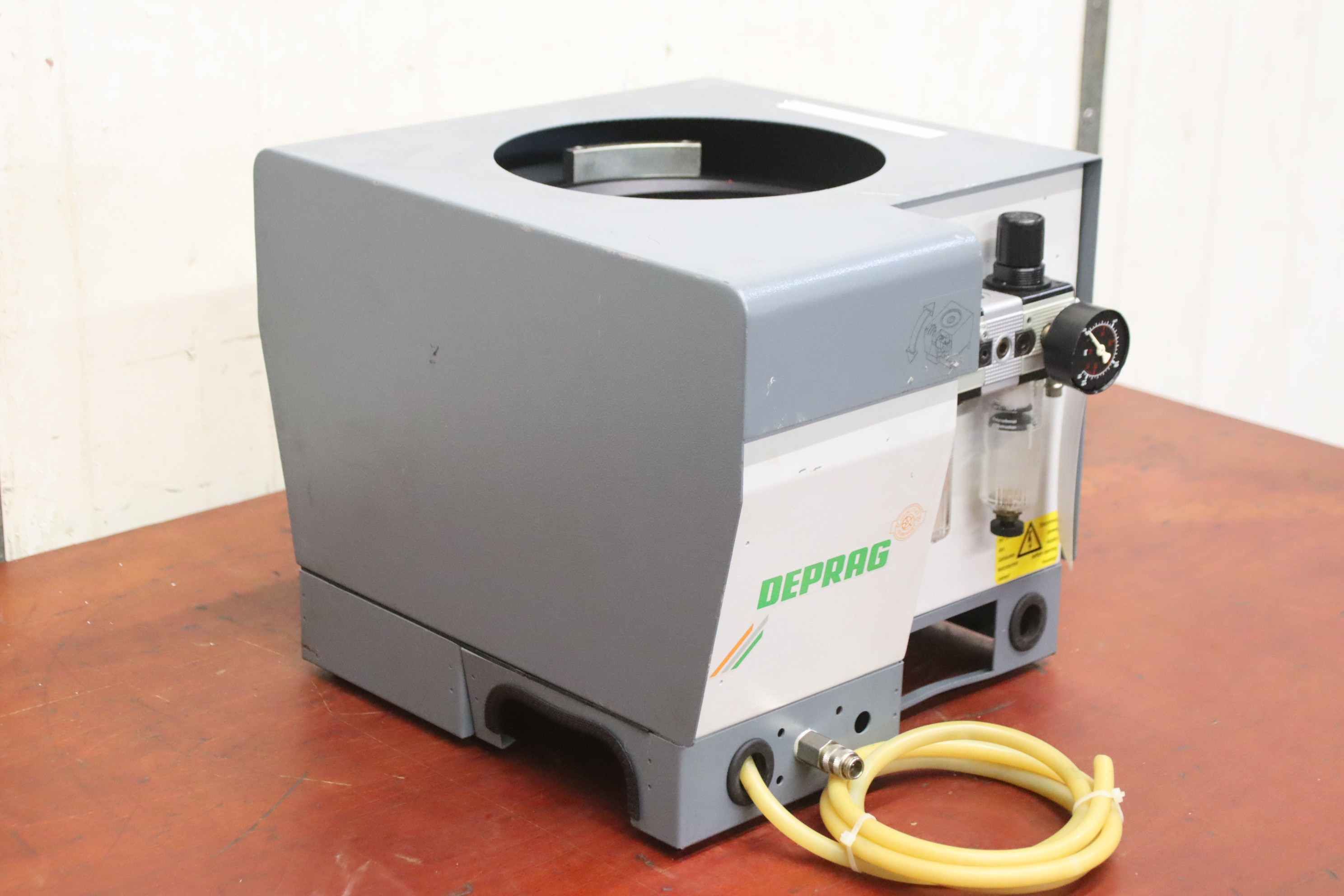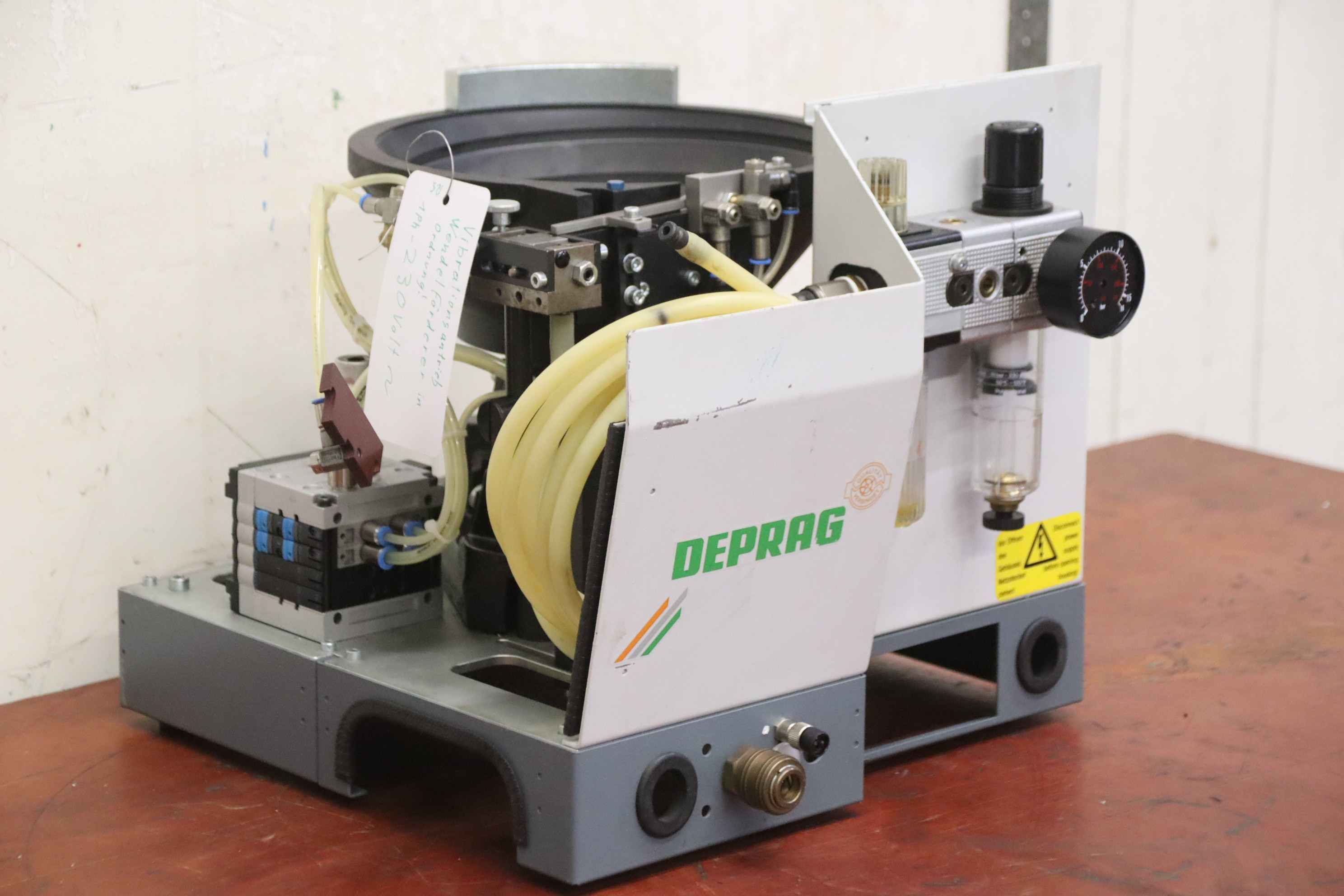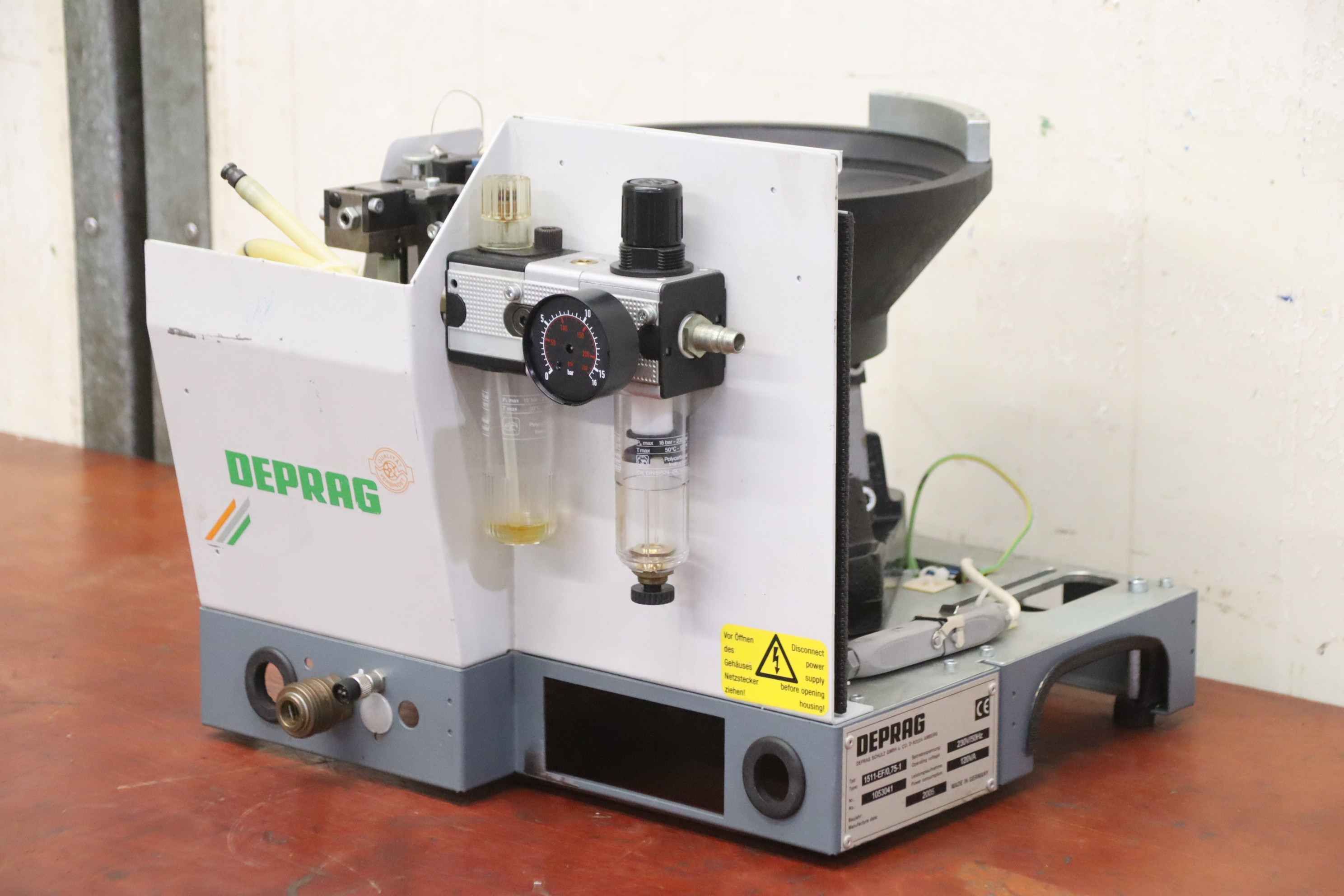 Vibrationsförderer, Schwingförderer, Vibrationszufuhrgerät, Zuführgerät, Wendelförderer, Vibrationsfüller, Vibrationswendelförderer, Vibrationsdosierer -Übergabe: im Ist-Zustand wie besichtigt -Gehäuse: Abdeckung fehlt -Hersteller: Deprag, Wendelförderer Vibrationsförderer -Typ: 1511-ES/0.75-1 -Anschluss: 230 Volt -Transportabmessung: 415/360/H325 mm -Gewicht: 23 kg