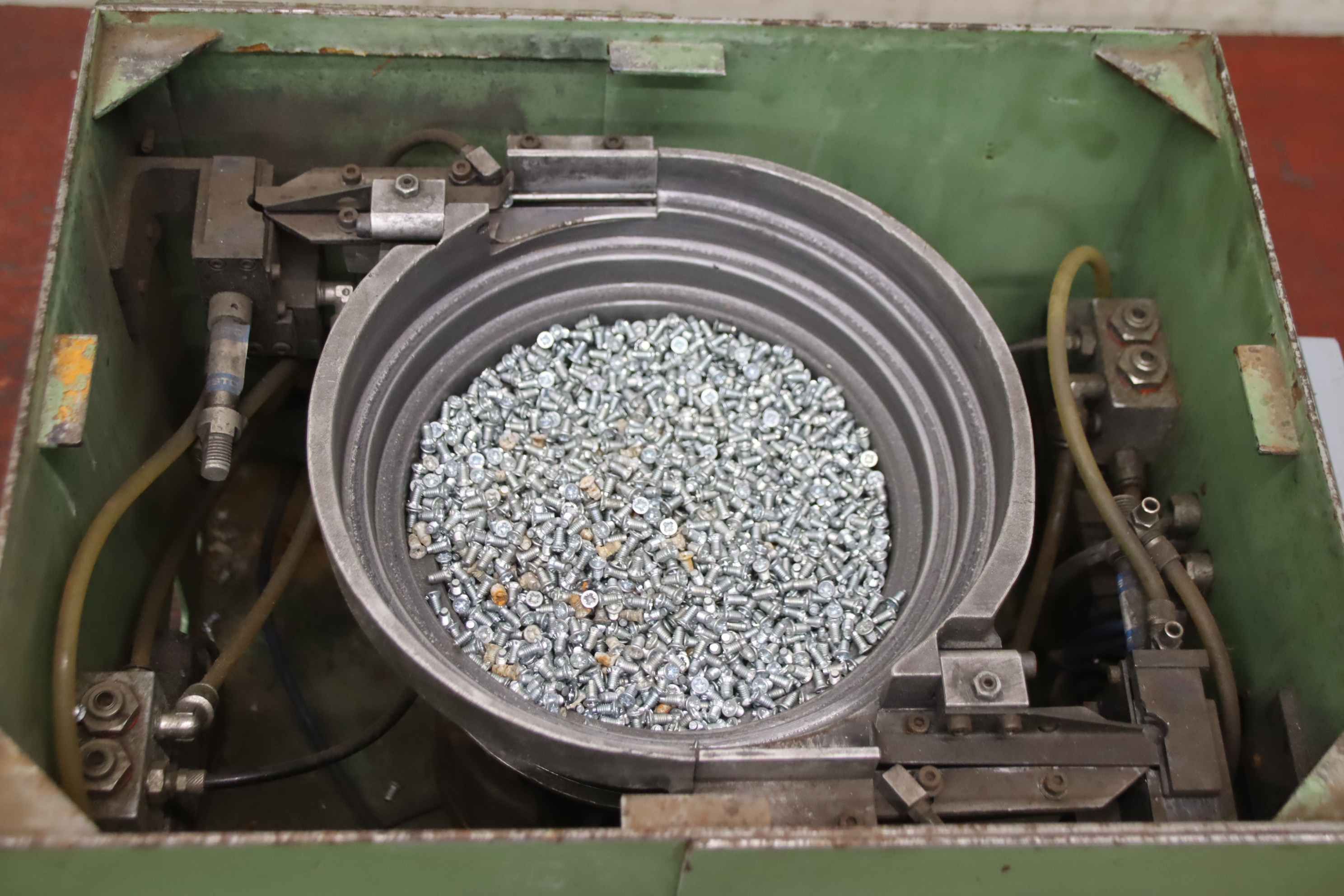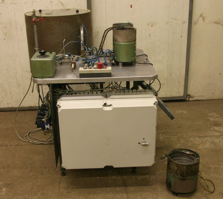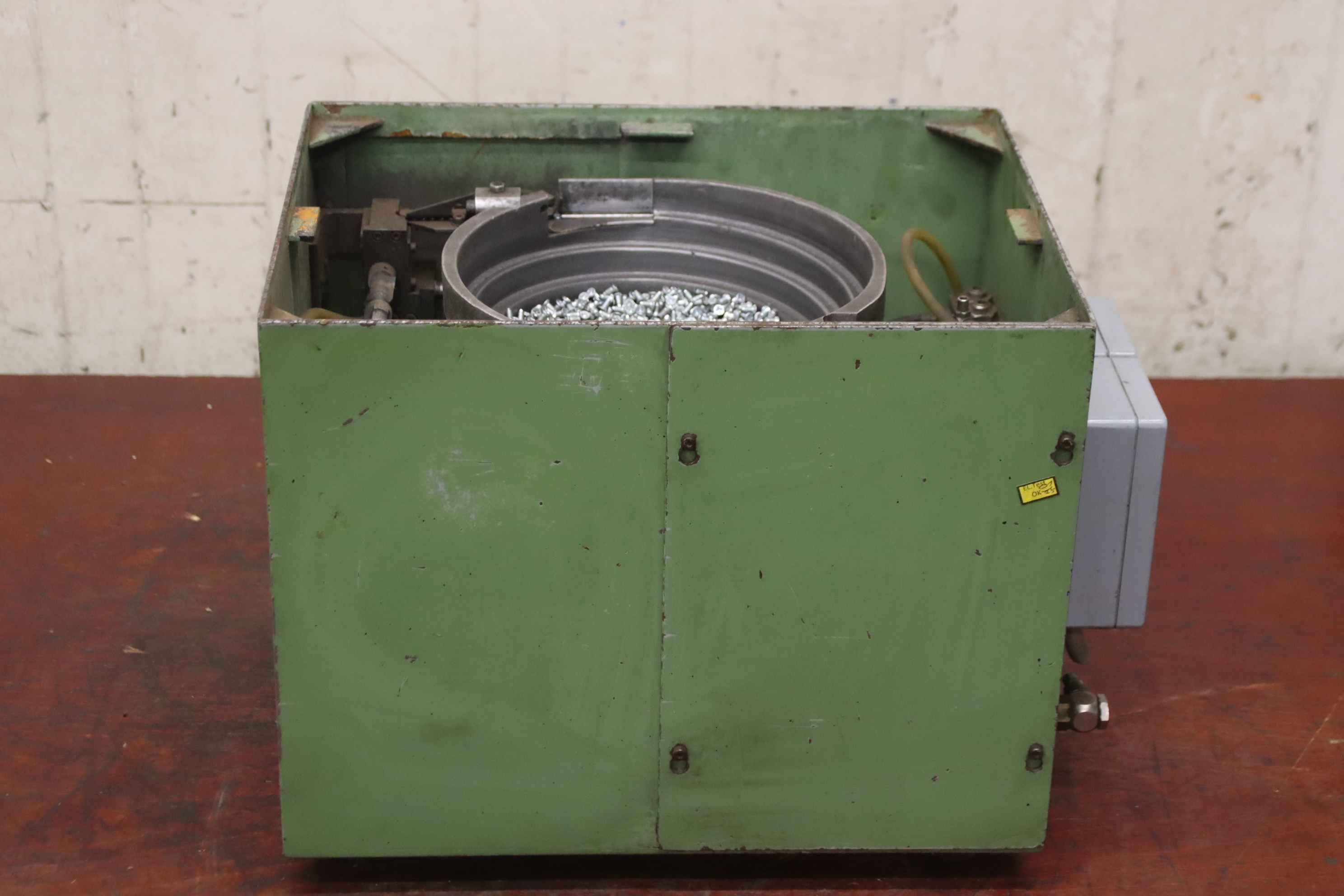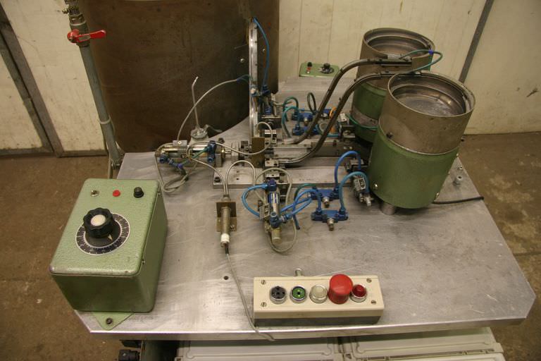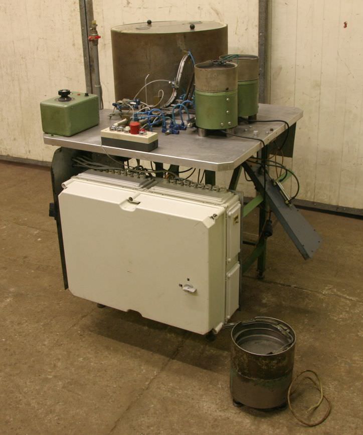 Vibrationsförderer, Schwingförderer, Vibrationszufuhrgerät, Zuführgerät, Wendelförderer, Vibrationsfüller, Vibrationswendelförderer, Vibrationsdosierer, Zuführtechnik, Zuführgerät, Voratsbehälter mit automatischer Zuführung -Zuführautomat mit Vorratsbehälter -Gerät ist für die Elektroschellen Herstellung gebaut worden -Abmessungen: 1300/1400/H1200 mm -Gewicht: 260 kg