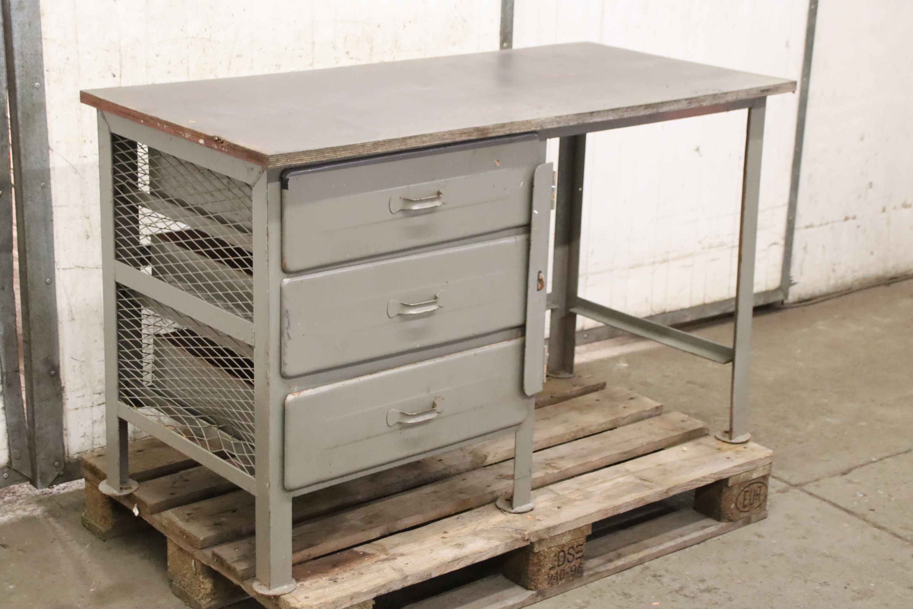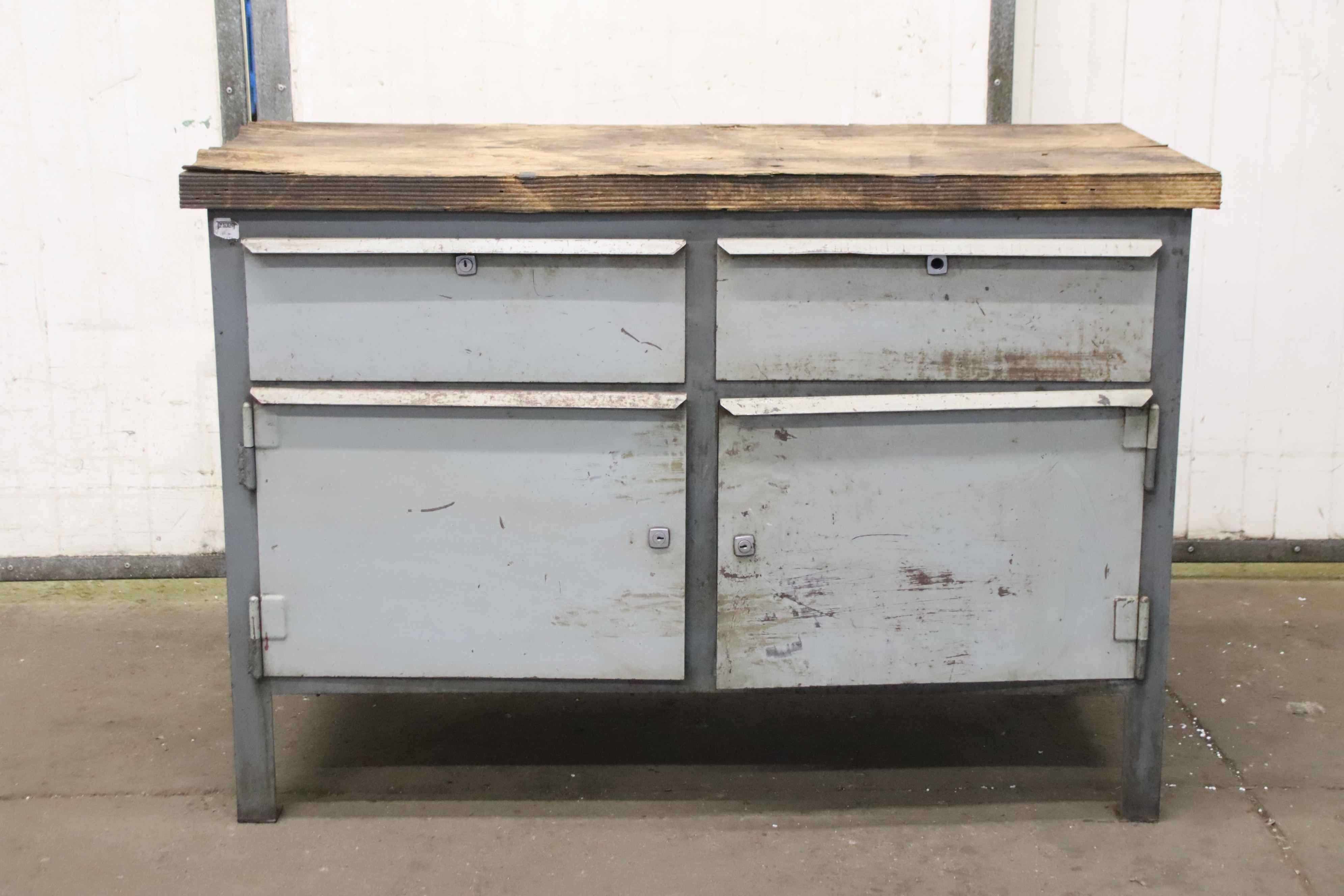 Werkbank, Arbeitstisch, Montagebank -Werkbank: mit Schubladen, massive Auführung -Breite: 1255 mm -Tiefe: 700 mm -Höhe: 880 mm -Schubladen/Schranktüren: jew. 2x, abschließbar / ohne Schloss/Schlüssel, siehe Fotos -Gewicht: 98 kg