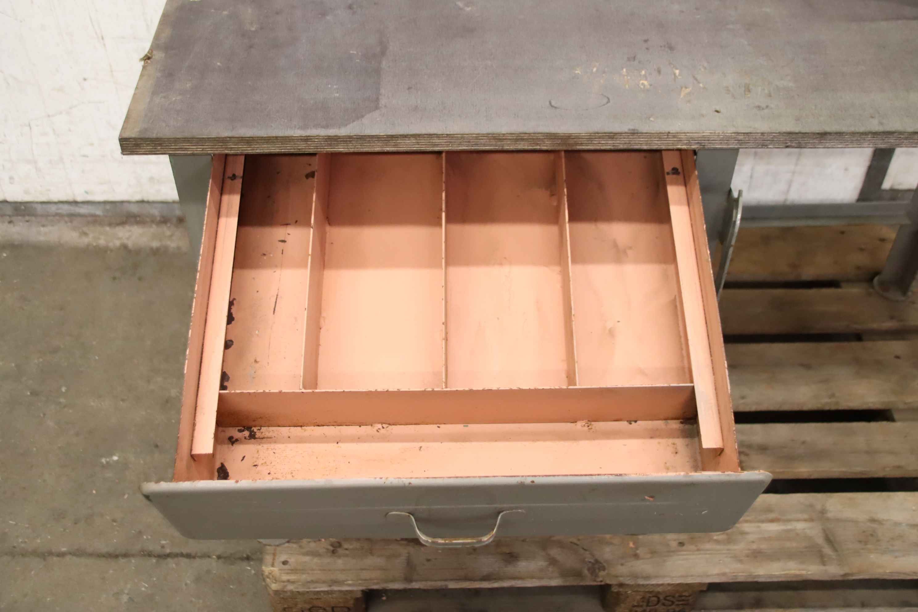 Werkbank, Arbeitstisch, Montagebank -Werkbank: mit Schubladen, massive Auführung -Breite: 1525 mm -Tiefe: 750 mm -Höhe: 850 mm -Schubladen/Schranktüren: jew. 2x, abschließbar / ohne Schloss -Anzahl: 2x Werkbank vorhanden -Preis: pro Stück -Gewicht: 106 kg/St.