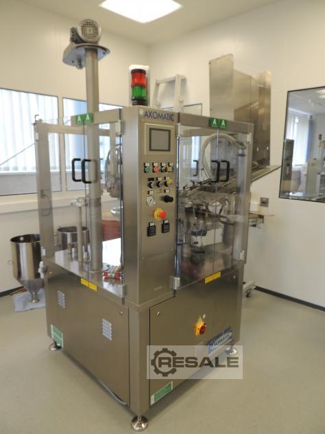 Gebrauchte Axomatic Optima 800/Axo 800. Abfüllanlage Hersteller Axomatic, Typ Optima 800/Axo 800 Baujahr 2008 Leistung max. 3.600 Tuben/h 6 Formatsätze 3 Kantenstanzapparate Füllvolumen 30-250 ml Tubendurchmesser 10-50 mm PE-oder Laminattuben Prägeeinheit für variable Daten im Tubenfalz (Datum und Charge Tubenausrichtung ca. 1100 Betriebsstunden Zusätzlich mit Ausschleusband