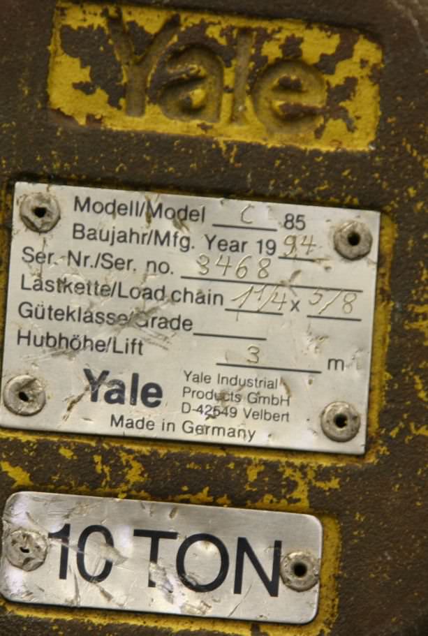E-Kettenzug, Elektro Hubwerk, Kran YALE Typ 5-10/10-5 Serien. Nr. 8526 Baujahr 1979 Traglast: 1000 kg Hakenweg: 3 Meter Hubgeschwindigkeit: 5 m/min. Feinhubgeschwindigkeit: 1,3 m/min. 2 Laststränge = 1000 kg Netzanschluß: 380 Volt, 50 Hz. - Aufhängeöse an der Kranoberseite - Bedienflasche mit Taster für Haupthub und Feinhub guter Zustand; gebraucht