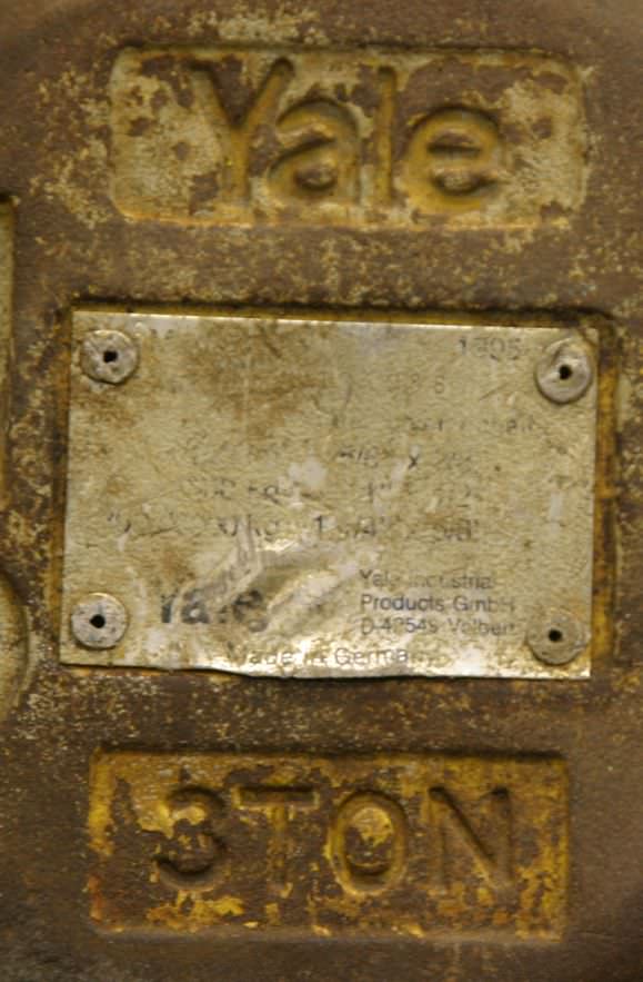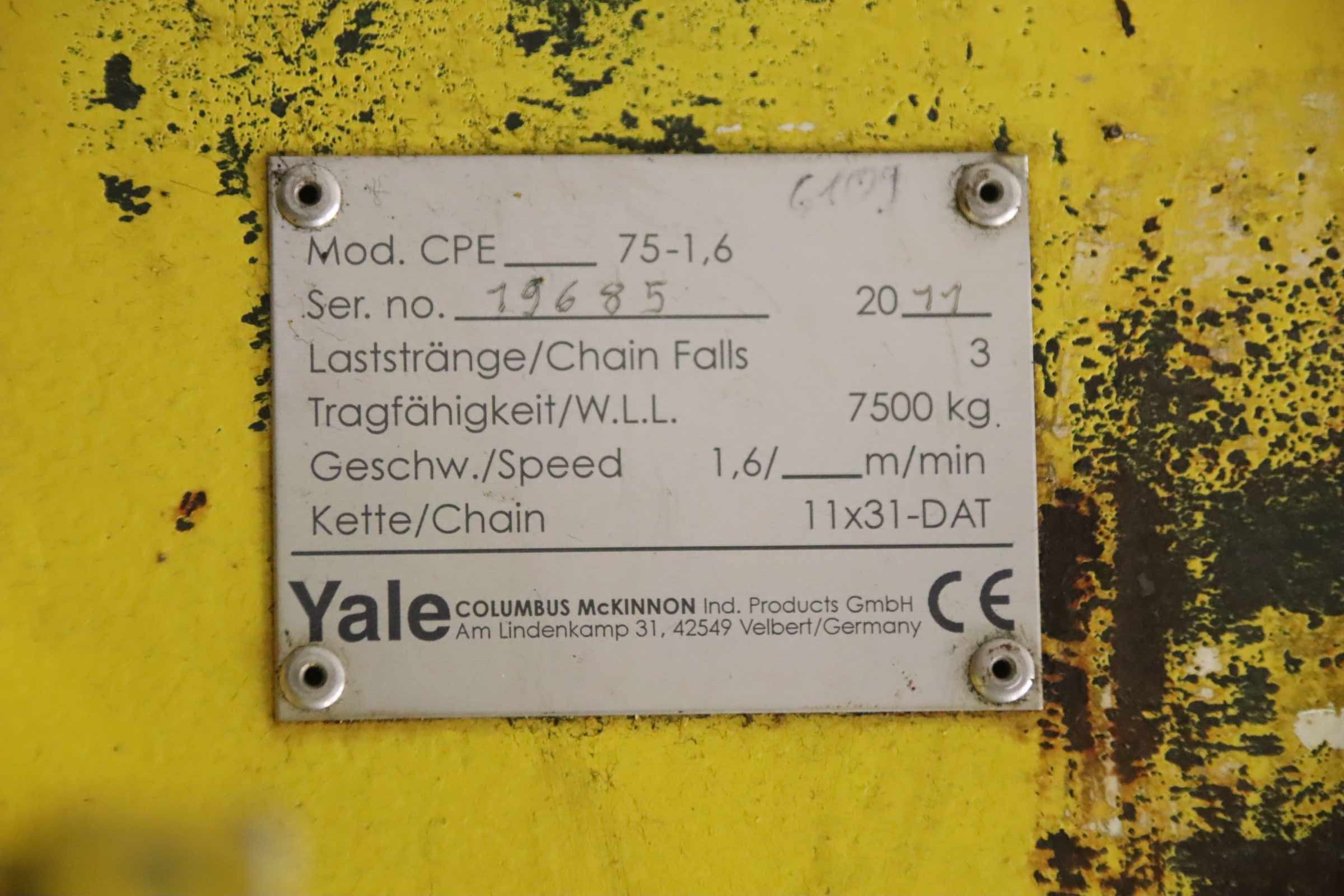 Elektro-Kettenzug, Kran, Hallenkran, Montagekran -Hersteller: Yale, Elektro-Kettenzug -Typ CPE 75-1,6 Tragfähigkeit 7500 kg -Haupthub: 1,6 m/min -Kettenlänge: 9 m -Transportabmessung: 1200/800/H520 mm -Gewicht: 235 kg