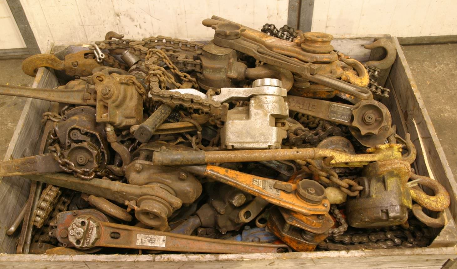 Hebelzug, Kettenzug, Kran, Montagezug, Montagekettenzug -Anzahl: 30x Stück Kettenzüge -verschiedene Hersteller: Yale, Brand, BKS -Tragkraft: von 750-3200 kg -Kettenlänge 1,0-2,5 m -Preis/Verkauf: komplett -größtenteils funktionsfähig -Abmessungen: 1200/800/H600 mm -Gewicht inkl. Verpackung: 600 kg