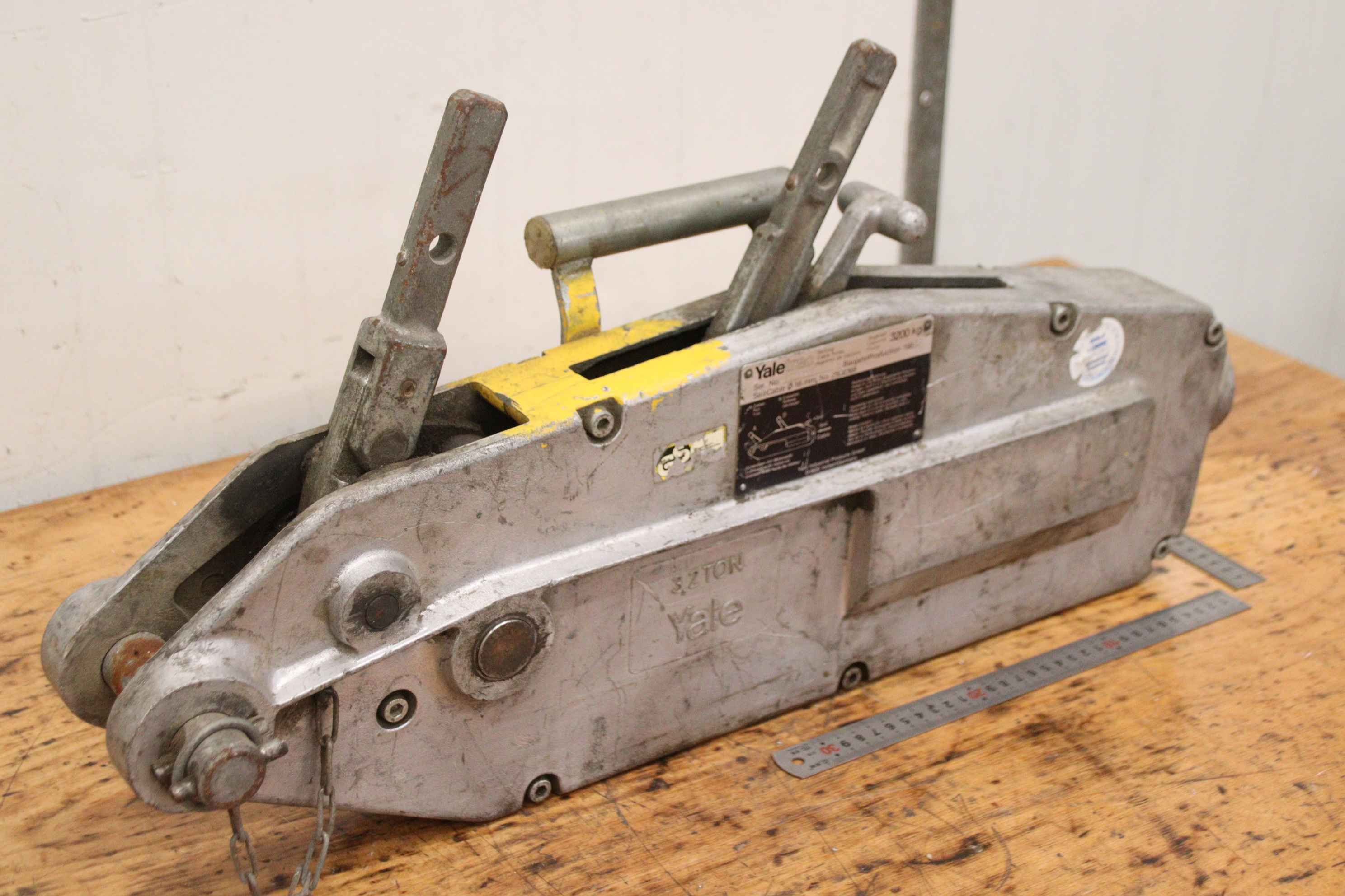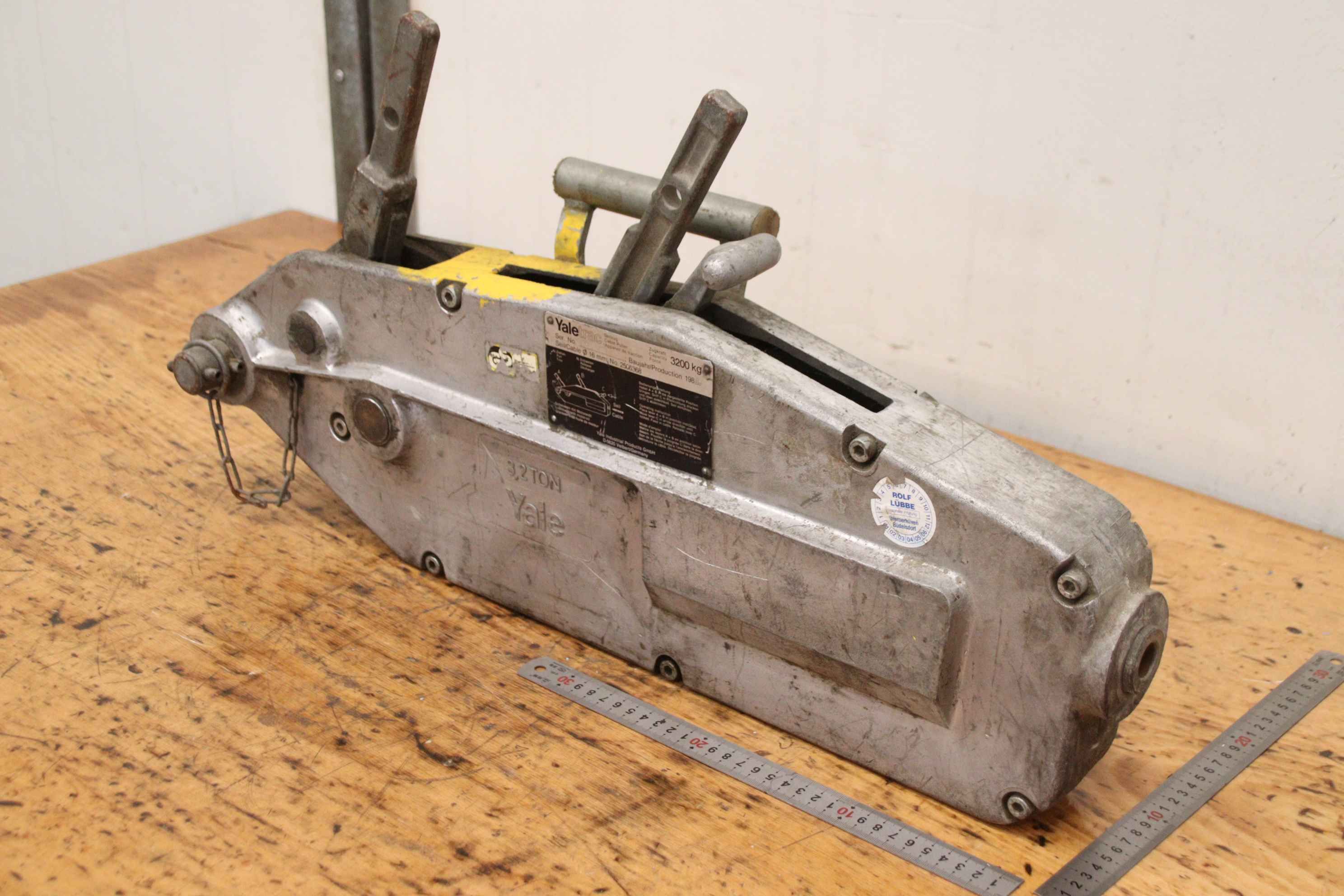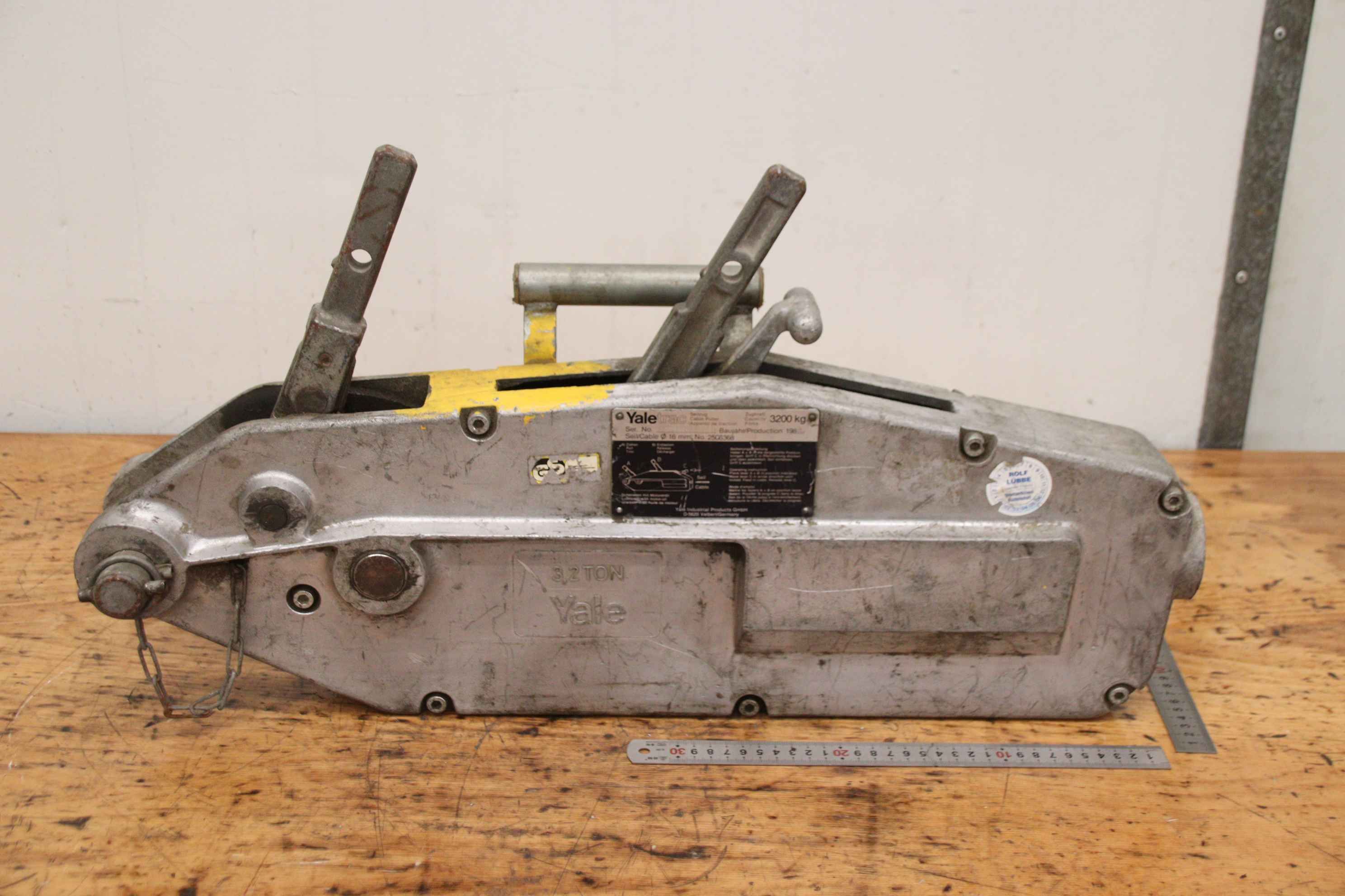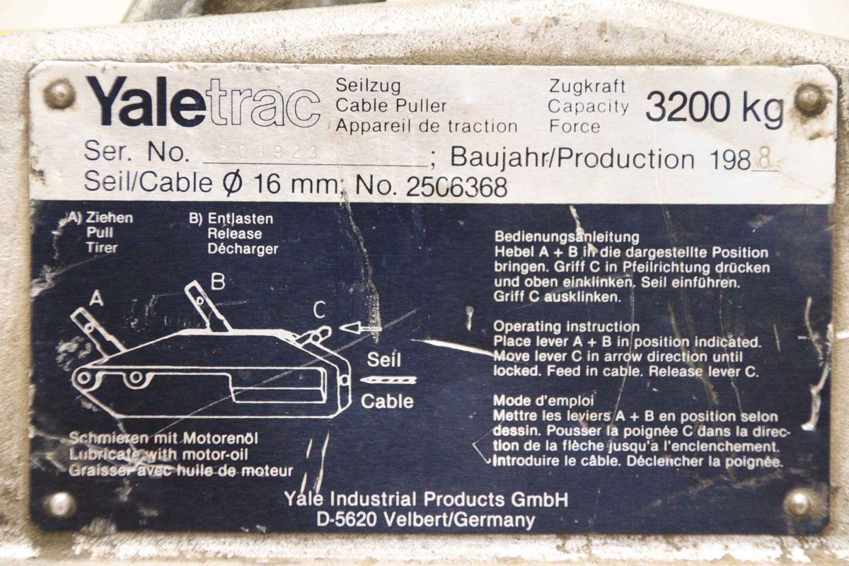 Mehrzweckzug, Greifzug, Hebezug, Montagezug, Seilzug, Universalseilzug, Seilzuggerät -Hersteller: Yalel, Mehrzweckzug Seilzuggerät Typ Yaletrac 3,2 TON -Belastbarkeit: 3200 kg -Stahlseil: Ø 16 mm / nicht im Lieferumfang, Auswahl auf Lager gegen Mehrpreis -Anzahl: 2x Seilzug vorhanden -Preis: pro Stück -Abmessungen: 700/150/H370 mm -Gewicht: 22 kg/St.